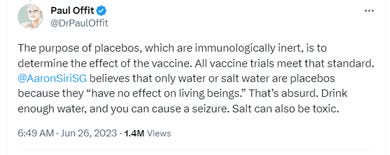 Offit also, on July 1, 2023, responded to the above Tweet in a Substack article which, as noted above, is titled The Casual Cruelty of Placebo-Controlled Clinical Trials. His entire article is in bolded text below (you don’t want to miss a word) and, between paragraphs, I provide responses.