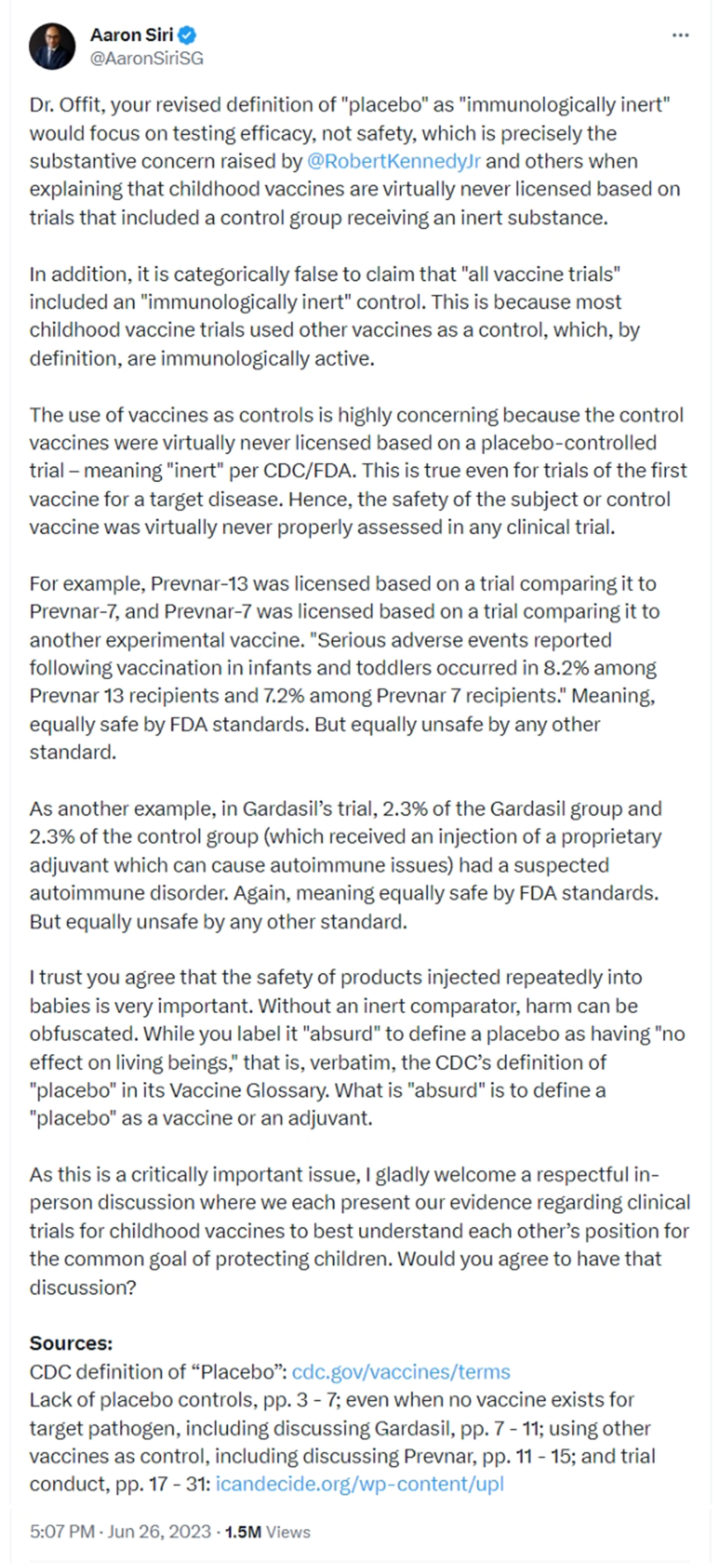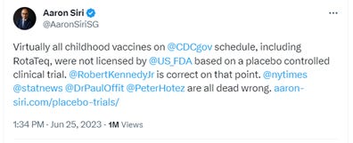 On June 25, 2023, in response to Offit’s claim that “all vaccines are tested in placebo-controlled trials before licensure,” I tweeted the following, linking an article with the proof – FDA sources – for my claim: