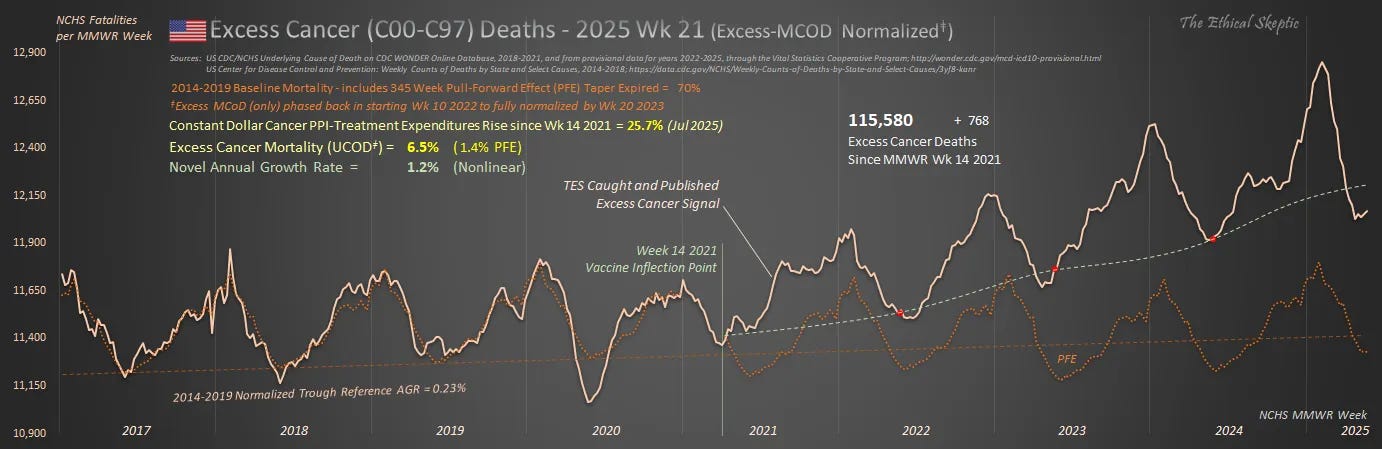 Since the rollout of COVID-19 mRNA injections, the United States has recorded more than 115,000 excess cancer deaths above baseline. These are not random fluctuations.
