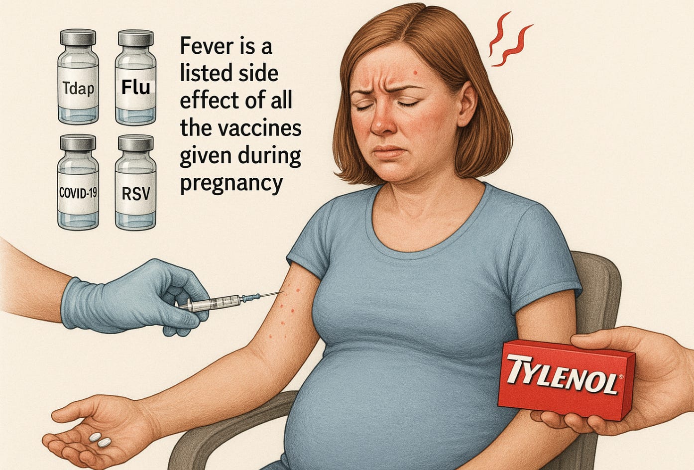 Regarding the link between autism and acetaminophen, pregnant women are given four vaccines—flu, COVID-19, Tdap, and RSV. Fever is a common side effect, and Tylenol is routinely advised as treatment.