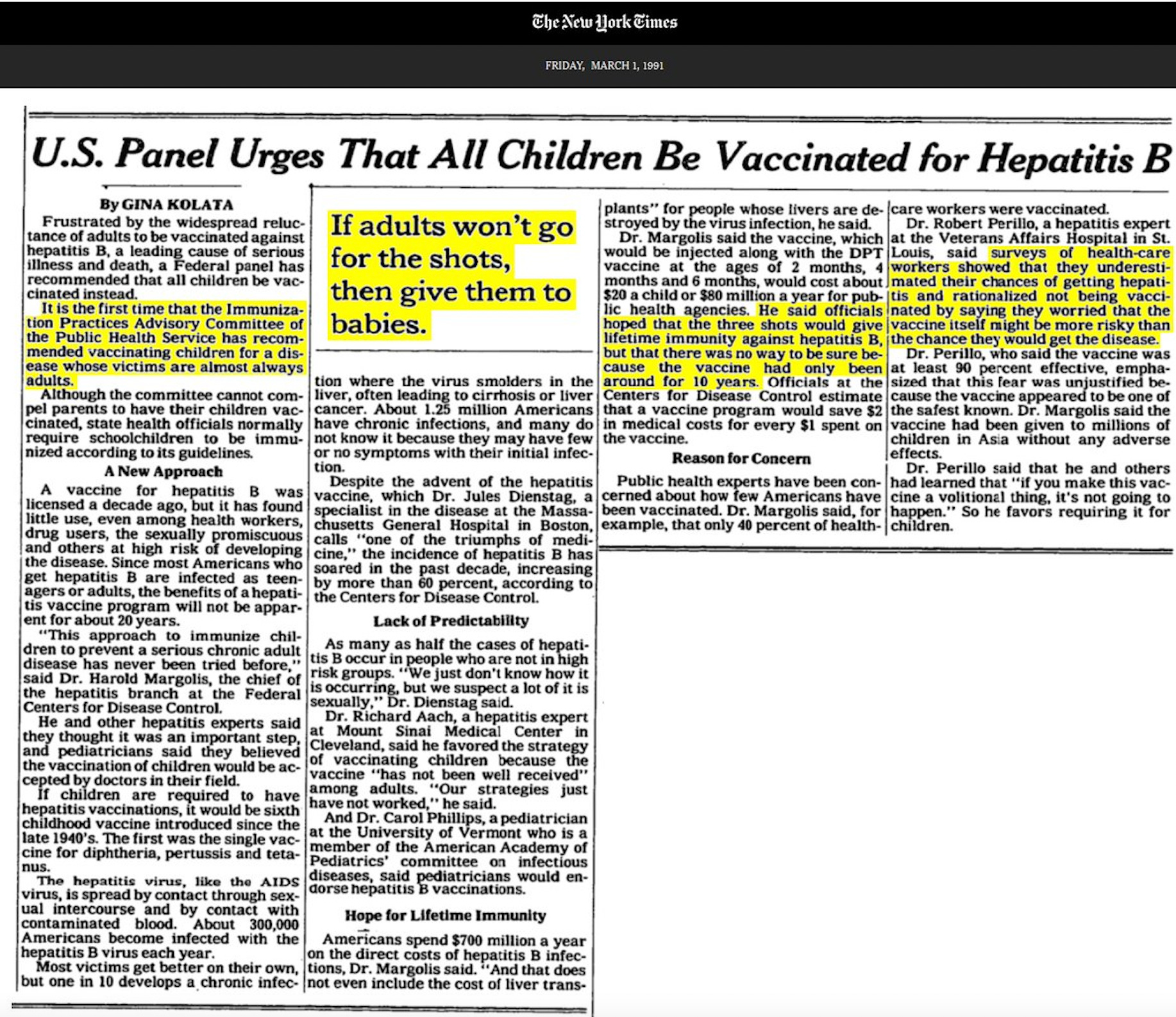 In 1991, the CDC ACIP panel added the Hep B vaccine part of the childhood schedule. The rationale was that, because so many sexually promiscuous adults refused to get the shot, the only way to deal with the problem was to administer the vaccine to ALL infants, with the first shot administered within 24 hours of birth.