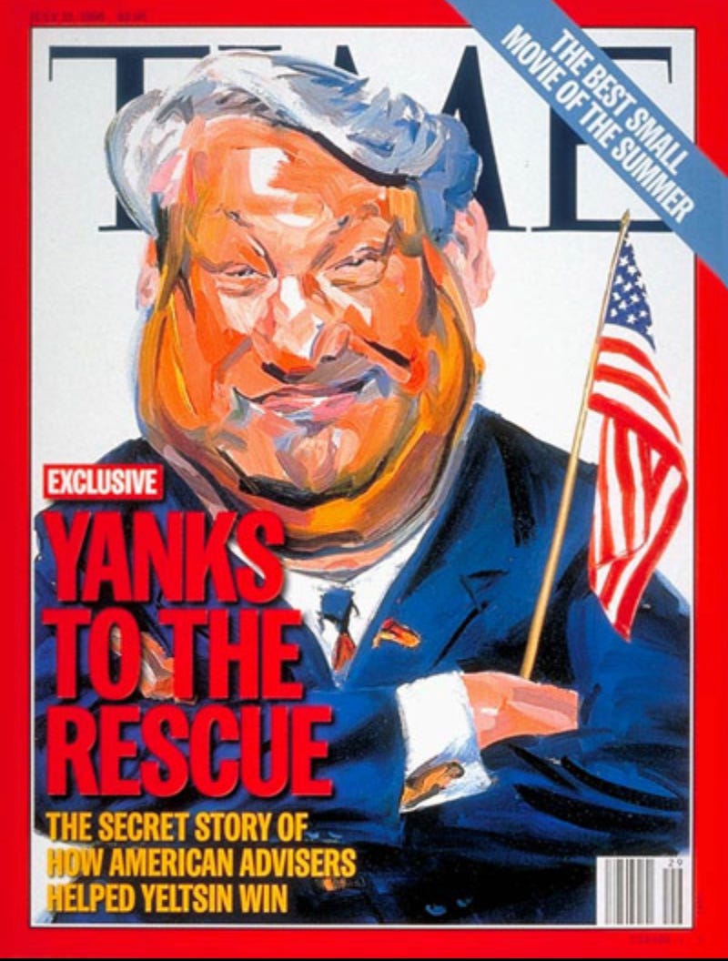 For example, let’s take the U.S. government’s catastrophic mismanagement of its relations with Russia for the last thirty years. I have closely observed this disaster in the making since I moved to Vienna, Austria for an academic fellowship in 1996. On the plane to Vienna I read the July 15, 1996 Time Magazine cover story about how secret American advisors helped Boris Yeltsin to win that year’s presidential election.
