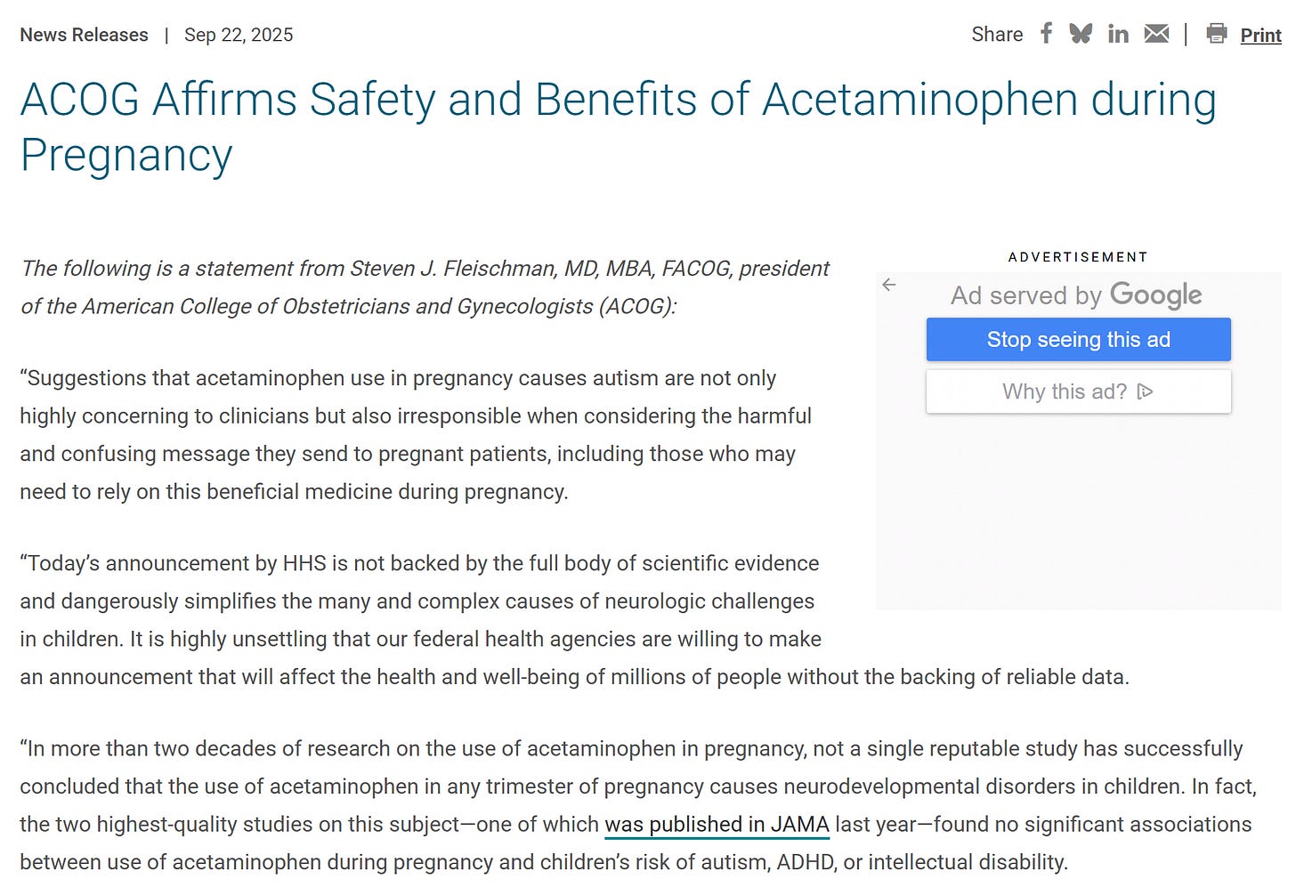 On September 22, 2025, the American College of Obstetrics and Gynecology said this about the HHS surprise acetaminophen announcement: