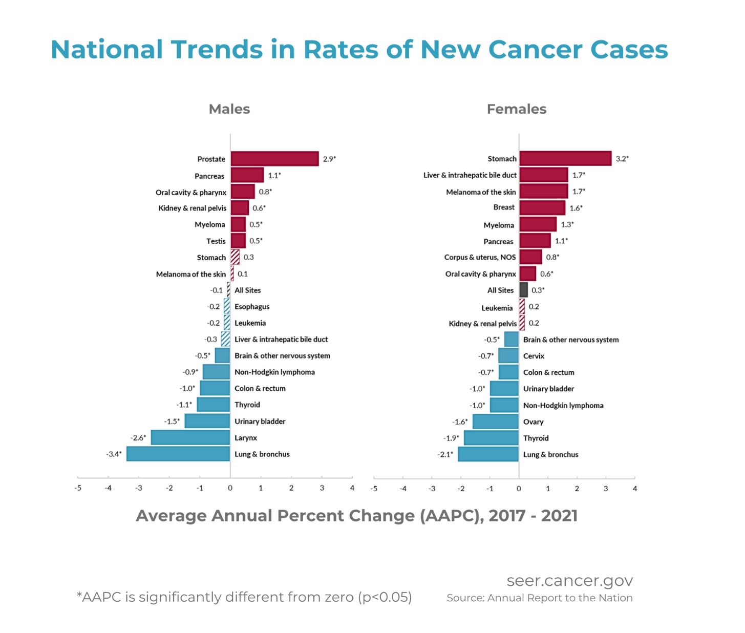 Overall, from 2018 to 2022, cancer death rates decreased an average of 1.7% per year for men and an average of 1.3% per year for women. Cancer death rates decreased an average of 1.5% per year from 2001 – 2022 among children. Among AYAs, cancer death rates fell by 2.9% per year from 2001 – 2005, 1% per year from 2005 – 2020, and then remained stable from 2020 – 2022.