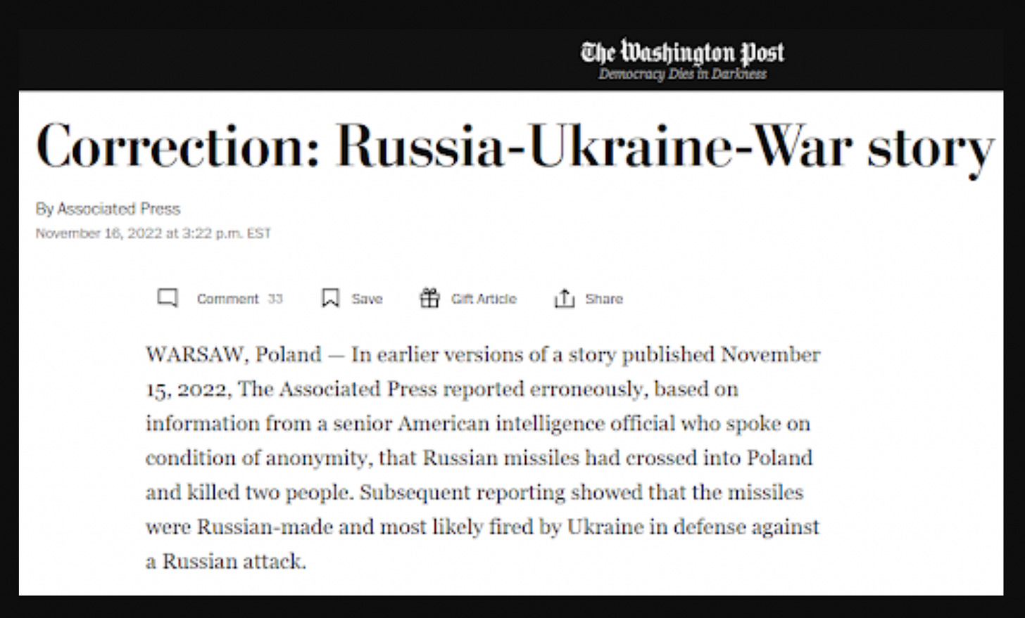 I wasn’t at all surprised to read in the correction that the missile was “most likely fired by Ukraine in defense against a Russian attack.” The question of why Ukrainian forces fired a missile towards Poland without proper guidance is apparently not being asked by our mainstream media, and perhaps not even by whoever is calling the shots of US-Nato policy in Ukraine.