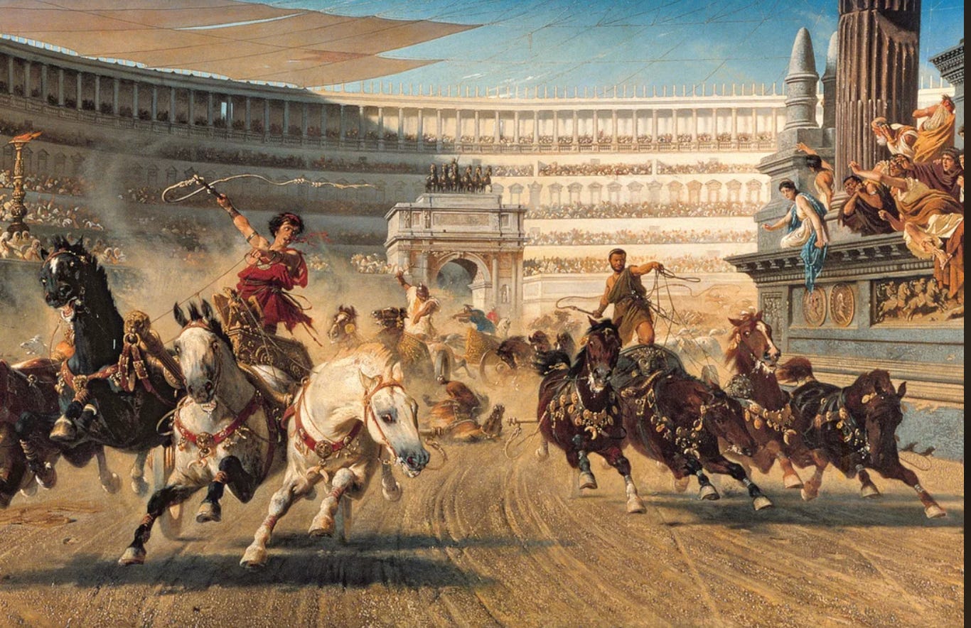 As readers of my recent columns know, I’ve lately been thinking about the fall of the Roman Republic and its replacement by dynastic emperors invested with direct command over the army. One thing that both Republican consuls and emperors all understood was the enormous power of gladiatorial games to distract and preoccupy the people. “Curse tablets” (sheets of lead inscribed by a stylus) have survived that record the passionate desire to see certain charioteers in the Circus Maximus vanquished. Some notable ones read: