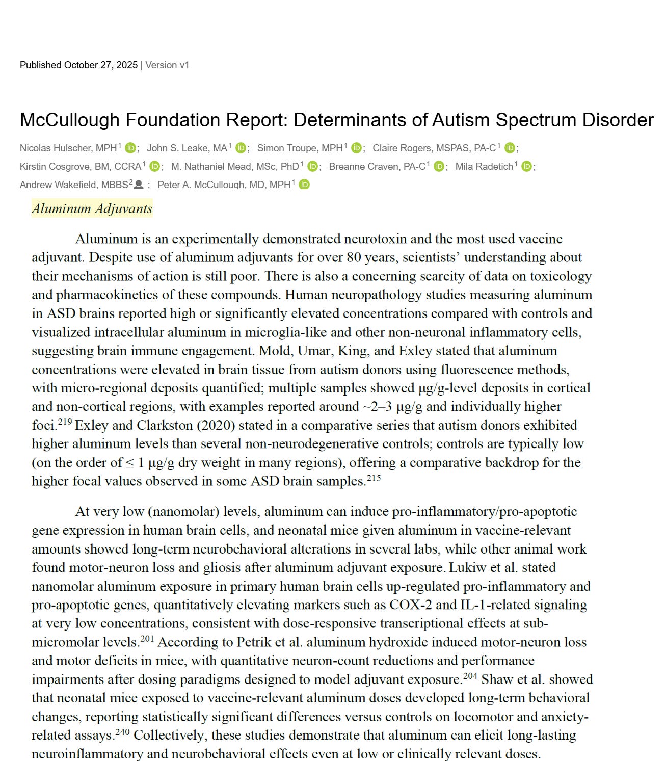 The conclusive McCullough Foundation Report on the Determinants of Autism Spectrum Disorder includes the published studies and concerns on aluminum in its holistic approach to the autism crisis.