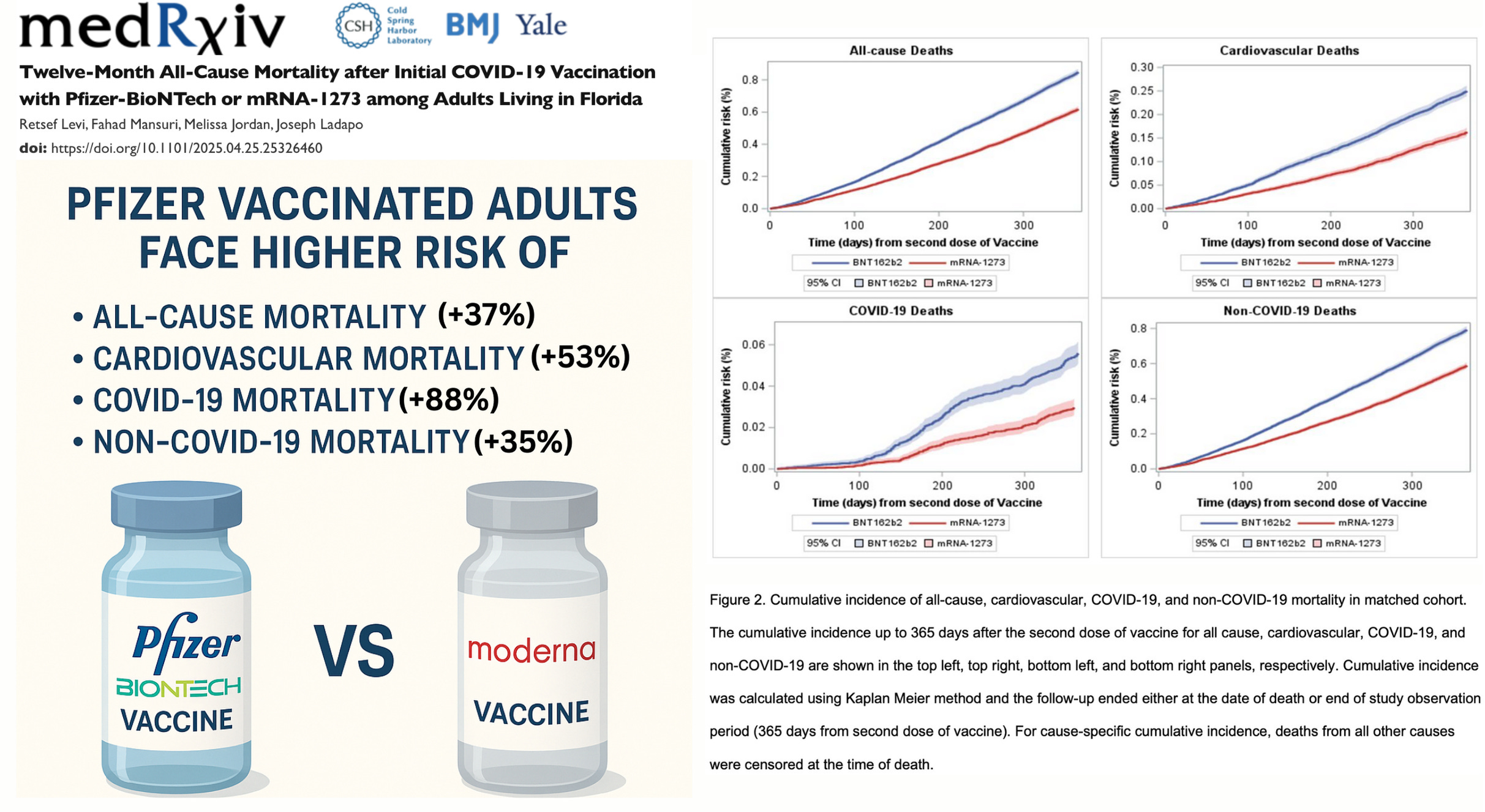Higher mortality risks among Pfizer recipients compared to Moderna recipients was also detected in a recent study of 1.47 million Florida adults by Dr. Retsef Levi and Florida Surgeon General Dr. Joe Ladapo: