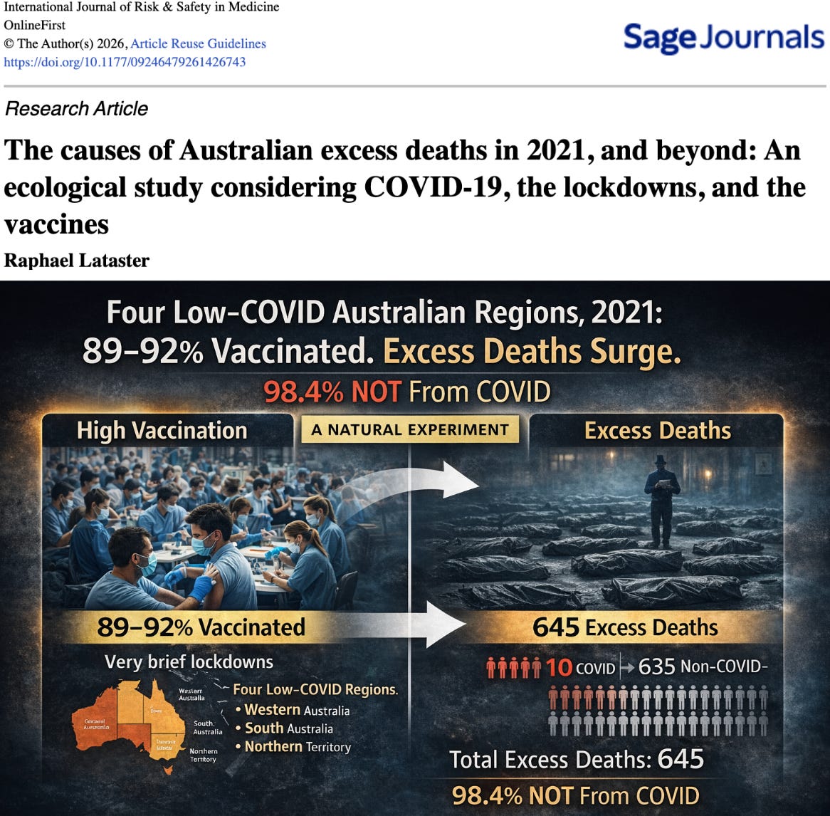 Yesterday, Raphael Lataster published an ecological analysis in the International Journal of Risk & Safety in Medicine examining excess mortality in Australia during 2021. Australia provided something rare: a real-world natural experiment. Several regions — Queensland, Western Australia, South Australia, and the Northern Territory — had very low COVID circulation in 2021, avoided prolonged lockdowns, yet injected nearly their entire adult populations with experimental shots.
