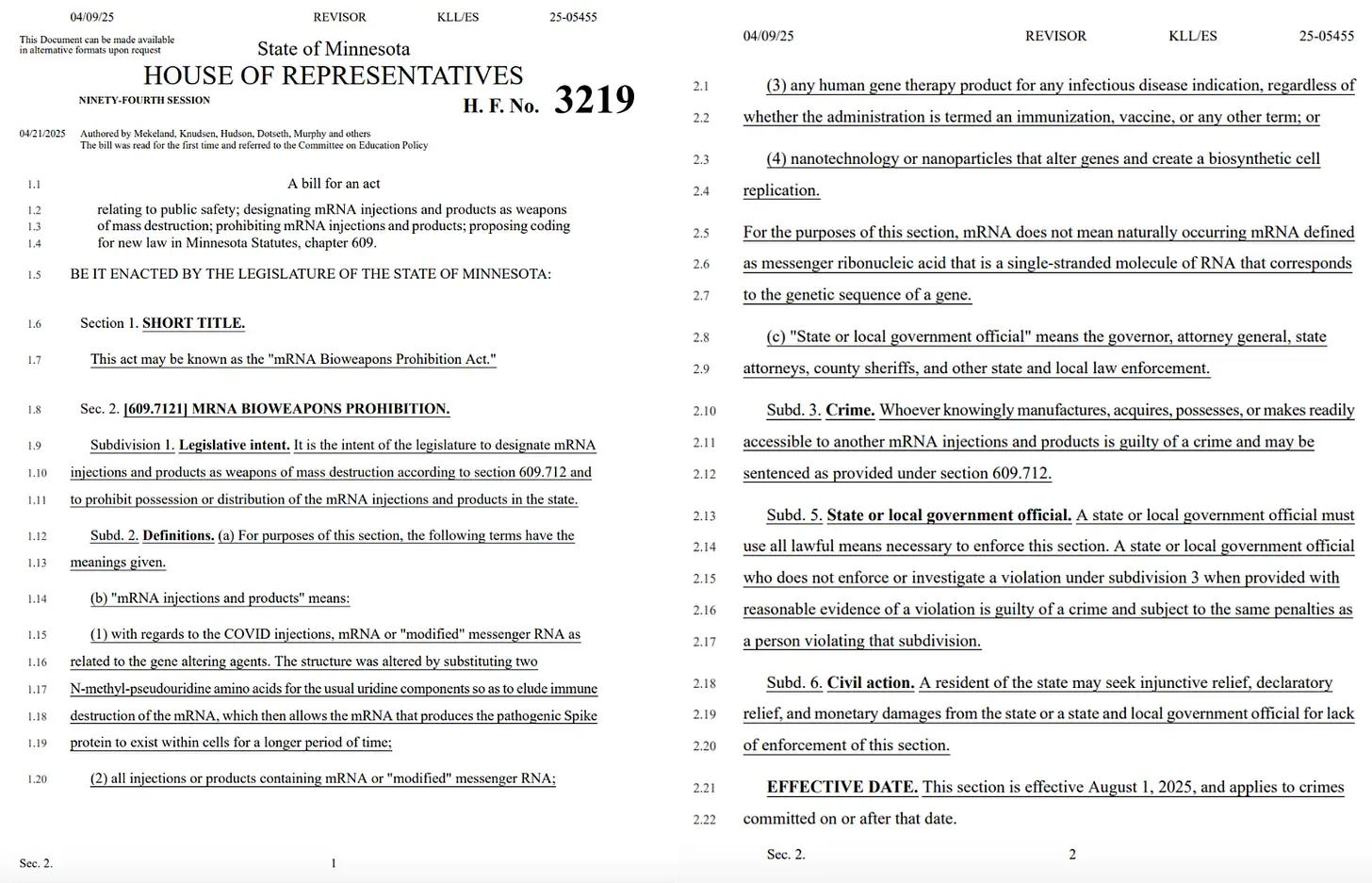 Manufacturing, possession, or distribution of mRNA injections would be prosecuted as terrorism, carrying penalties of up to life imprisonment if a violation results in death.