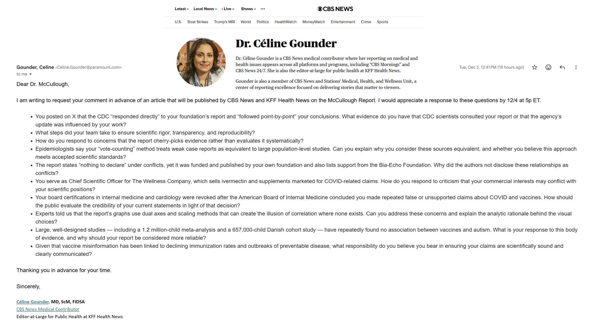 Dr. Celine Grounder has an impressive educational pedigree. She received her BA in Molecular Biology from Princeton University, her Master of Science in Epidemiology from the Johns Hopkins Bloomberg School of Public Health, and her MD from the University of Washington. Gounder was an intern and resident in Internal Medicine at Harvard’s Massachusetts General Hospital and a post-doctoral fellow in Infectious Diseases at Johns Hopkins University. Gounder is a clinical associate professor of medicine and infectious diseases at New York University’s Grossman School of Medicine. She also treats patients at Bellevue Hospital Center. Before joining CBS, Gounder was a CNN medical analyst. She’s also published more than 100 OPEDs in outlets such as the New York Times, The Atlantic, The New Yorker and the Washington Post. Despite these accomplishments she has little experience in the world of academic scholarship and publication with only 12 listings in the National Library of Medicine compared to my 712 and the McCullough Foundation with overall >1000 published scientific communications. Grounder has made no significant contributions to the field of medicine. You can tell by the questions she had not read all 127 pages of The Report and supplemental materials. Nor does she identify any credentialed “experts” or “epidemiologists” in her questions. I can tell you none have reached out to me.