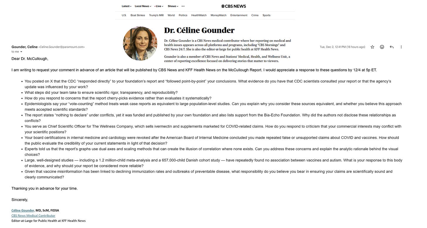 Unsurprisingly, CBS Health News and Kaiser Family Foundation (KFF) Health News backed by The Gates Foundation, a prominent force behind vaccine development and promotion, sent their most accomplished medical journalist to The McCullough Foundation for a round of biased questions.