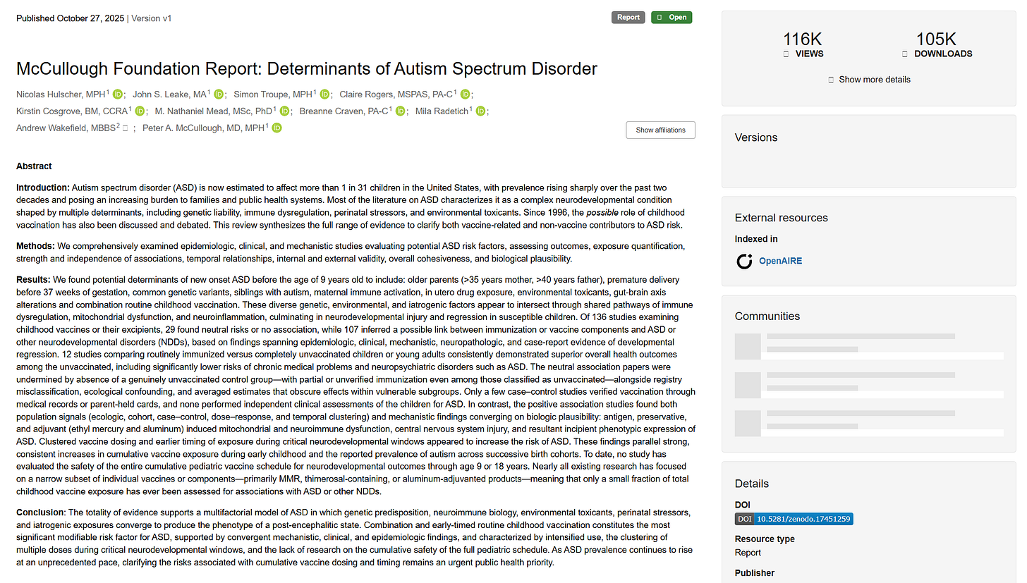 Hulscher N., Leake J. S., Troupe S., Rogers C., Cosgrove K., Mead M. N., Craven B., Radetich M., Wakefield A., & McCullough P. A. (2025). McCullough Foundation Report: Determinants of Autism Spectrum Disorder. Zenodo. Version 1 (October 27 2025). DOI: 10.5281/zenodo.17451259 https://zenodo.org/records/17451259