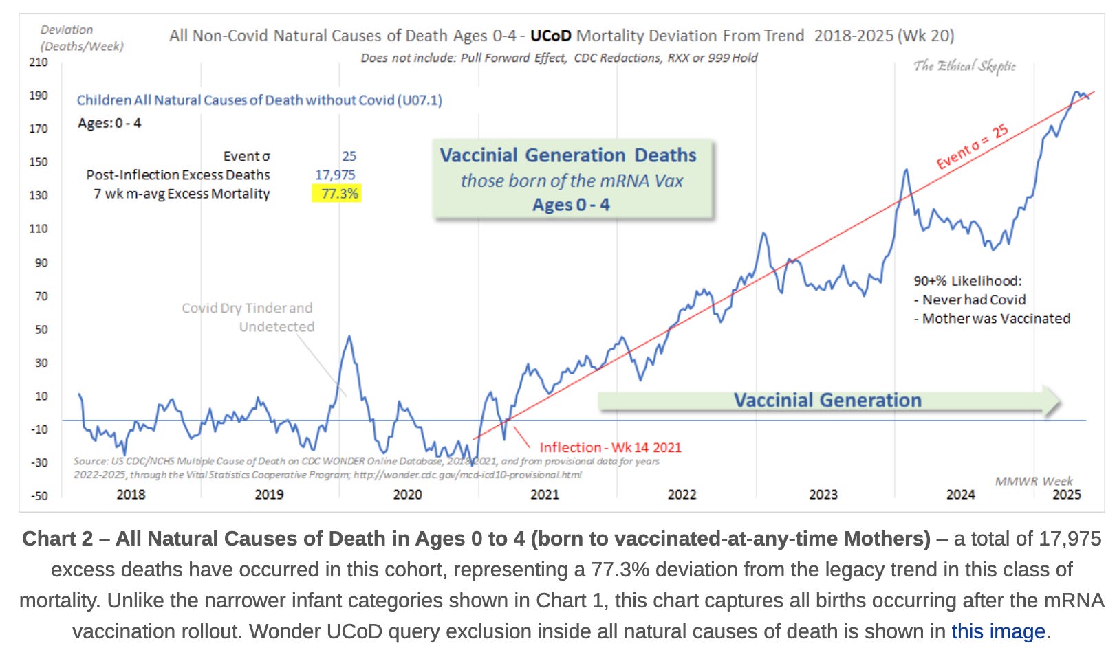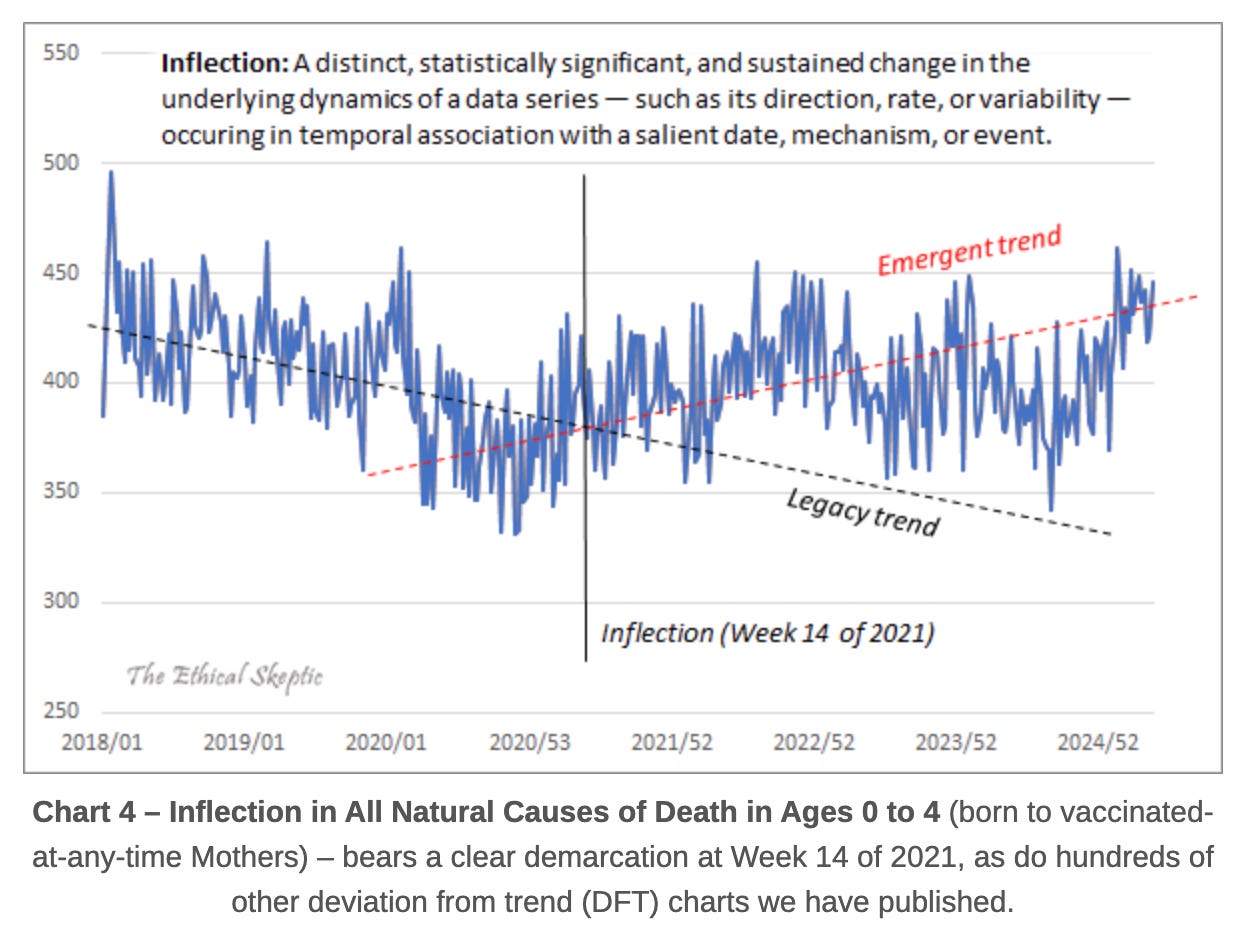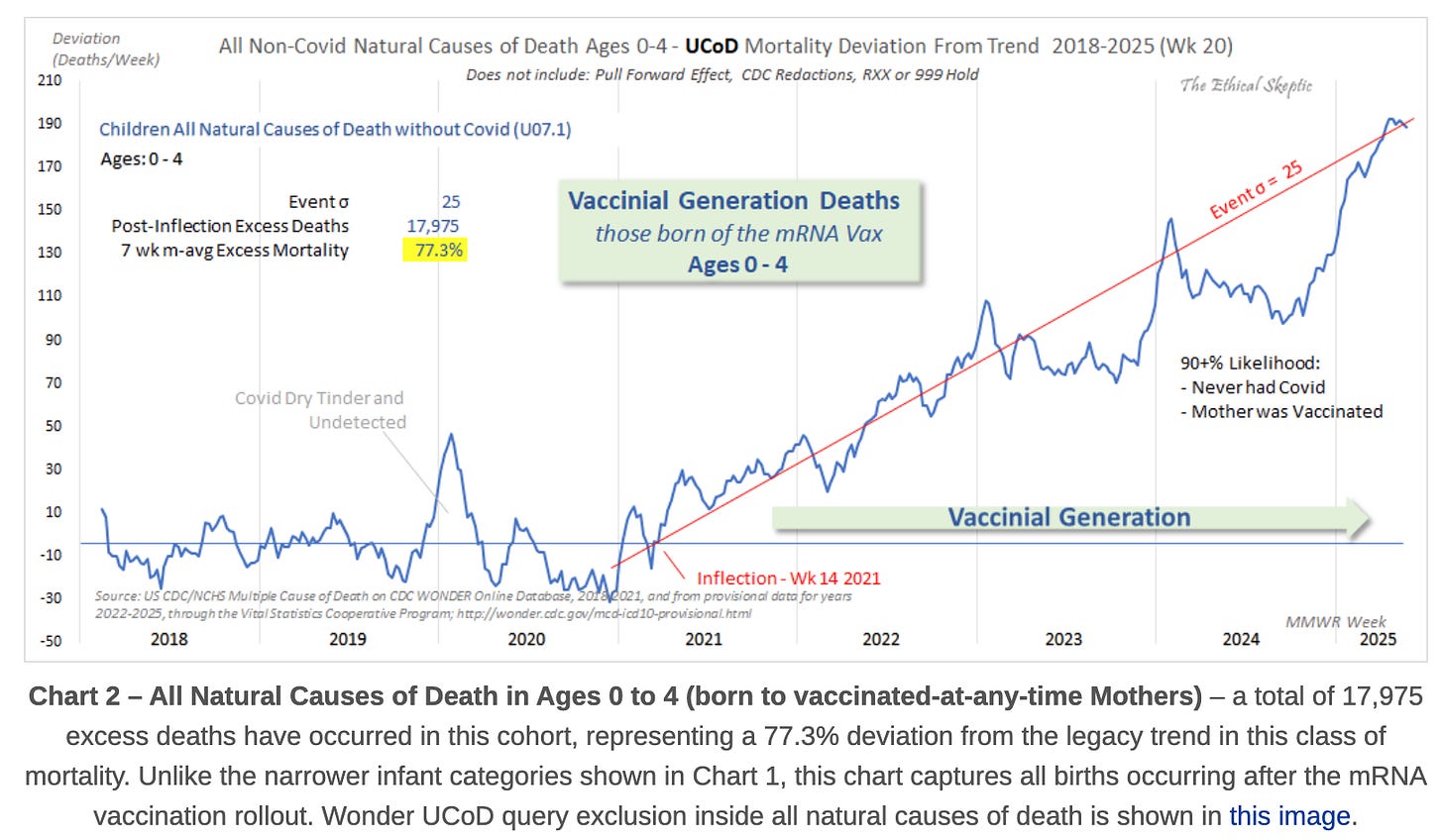 A new analysis by The Ethical Skeptic of CDC/NCHS death certificate data using Deviation from Trend (DFT) analysis reveals a disturbing development: a sharp, sustained rise in infant and child mortality among those who neither had COVID-19 nor received the vaccine, but whose parents were previously exposed to mRNA injections.