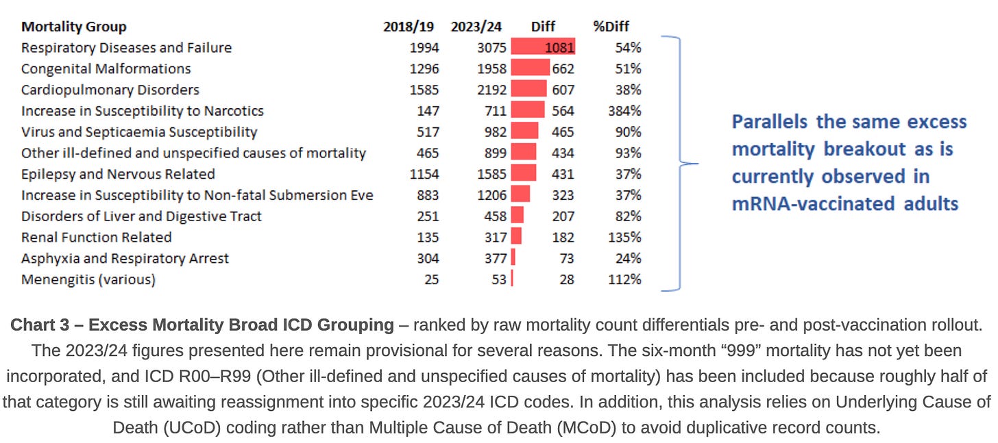 Figure 2 (All Natural Causes of Death in Ages 0–4) reveals 17,975 excess deaths in this cohort—representing a 77% increase above baseline.