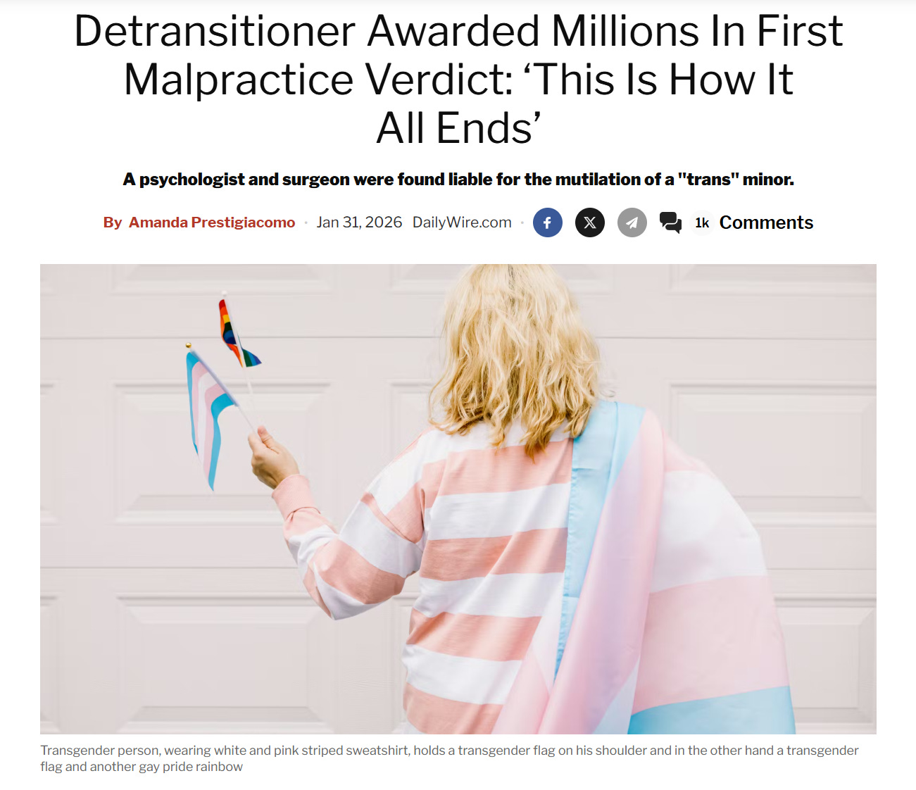 According to the January 31, 2026 Daily Wire report “Detransitioner Awarded Millions in First Malpractice Verdict: ‘This Is How It All Ends’”, the Westchester County jury awarded Fox Varian now 22 years old, $2 million ($1.6 M for pain and suffering, $400K for future medical expenses) after finding both her psychologist Dr. Kenneth Einhorn and her plastic surgeon liable for malpractice in performing and facilitating a double mastectomy when she was 16.