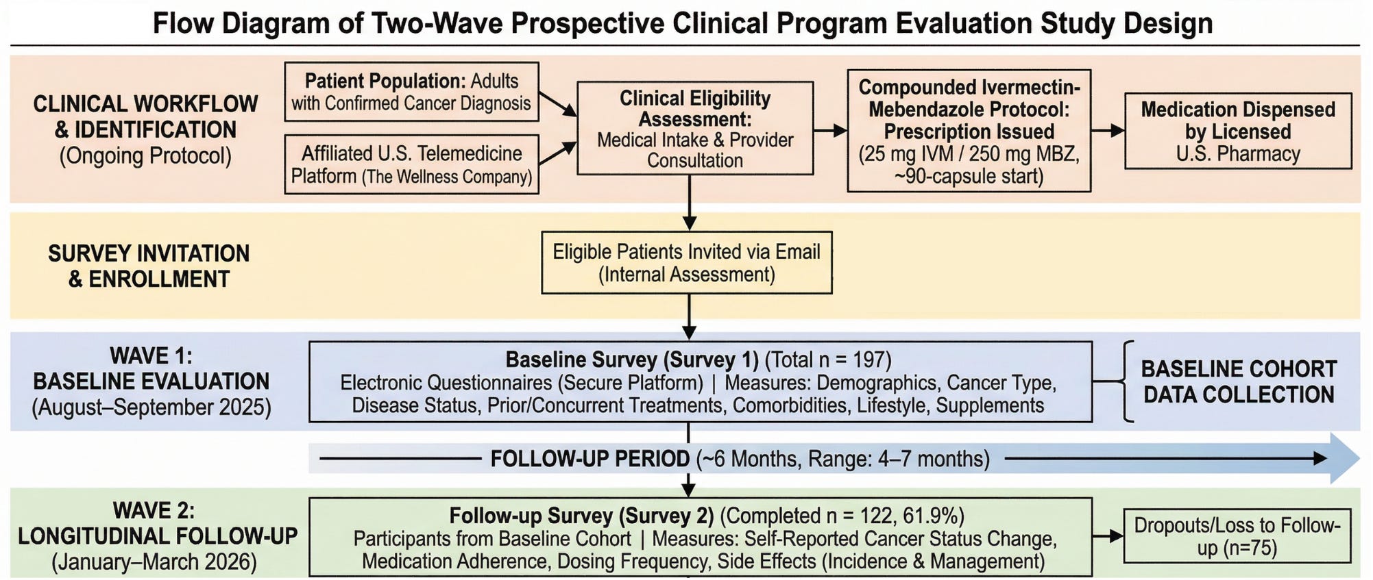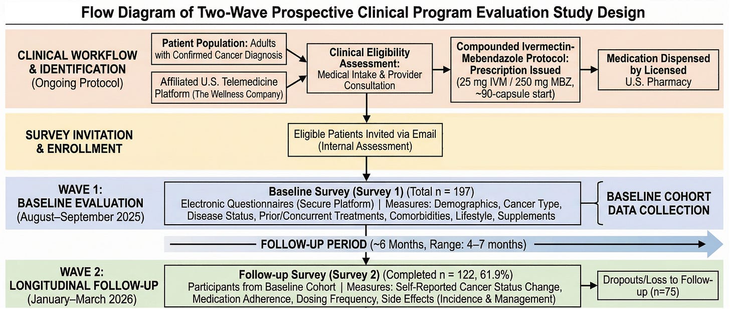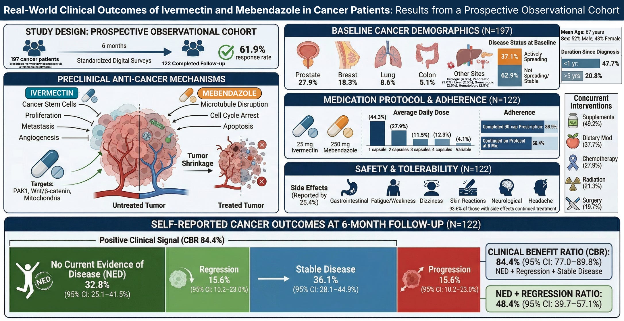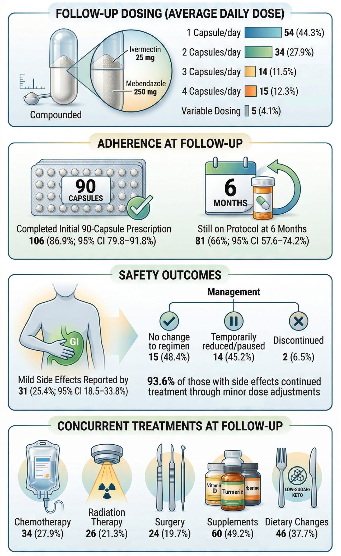 We analyzed a prospective observational cohort of 197 cancer patients, with 122 completing structured follow-up at approximately six months (61.9% response rate). Patients were prescribed a compounded ivermectin–mebendazole protocol by licensed U.S. providers, and outcomes were collected through standardized digital surveys assessing cancer status, adherence, and safety.