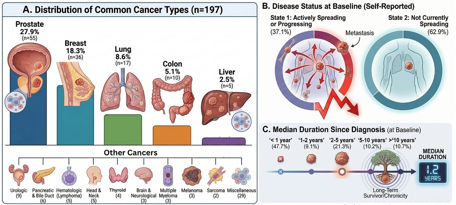 Our cohort represents a broad and clinically meaningful cross-section of cancer patients, including prostate (27.9%), breast (18.3%), lung (8.6%), colon (5.1%), and a wide range of additional malignancies.