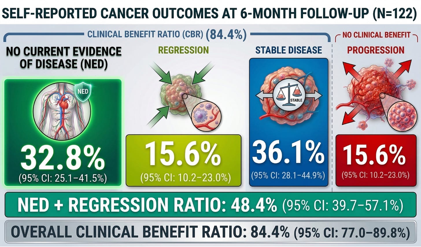 At approximately six months post-treatment initiation, we observed an 84.4% Clinical Benefit Ratio (CBR), with nearly half of cancer patients (48.4%) reporting either no evidence of disease (32.8%) or tumor regression (15.6%). An additional 36.1% reported disease stabilization. This means more than four out of five patients reported either improvement or stabilization of their cancer.