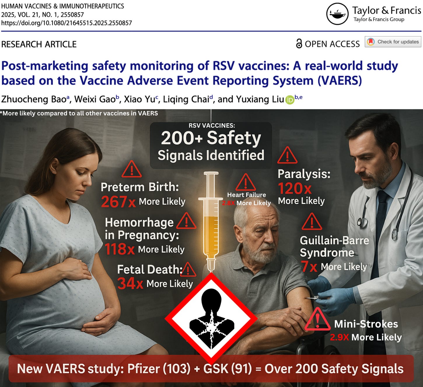 A new peer-reviewed pharmacovigilance study just published in Human Vaccines & Immunotherapeutics analyzed nearly 18,000 adverse event reports tied to the three FDA-approved RSV vaccines — Pfizer’s Abrysvo, GSK’s Arexvy, and Moderna’s mRESVIA.