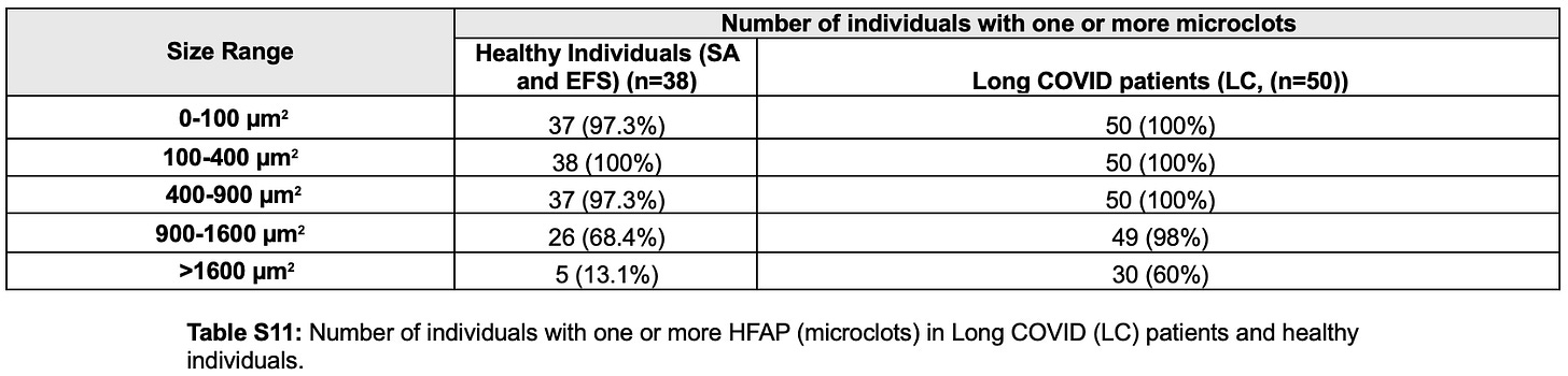 And according to Table S11, every single vaccinated participant had amyloid microclots in multiple size ranges: