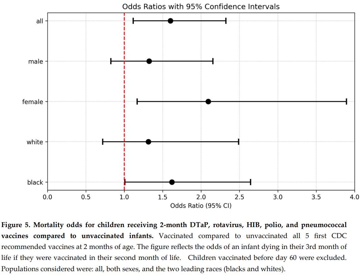 Most alarming, infants who received all six recommended 2-month vaccines had a 68% higher odds of death overall (OR = 1.68; p = 0.0043), with the risk surging to +68% in Black infants and +112% in female infants (OR = 2.12; p = 0.0083).