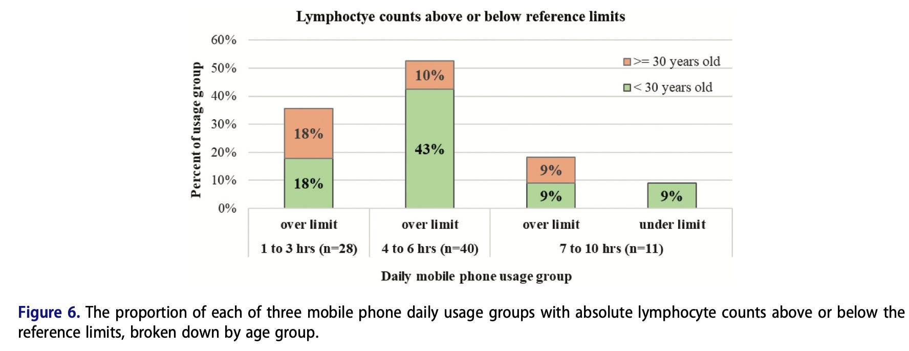 And it wasn’t only about living near a tower. Heavy daily mobile phone use — particularly 4 to 6 hours per day — was also associated with noticeable immune changes. In that group, more than 50% had lymphocyte levels above normal reference ranges, again largely among younger adults. These are white blood cells involved in immune defense, and when they consistently rise above normal levels, it signals that the body may be responding to ongoing biological stress.
