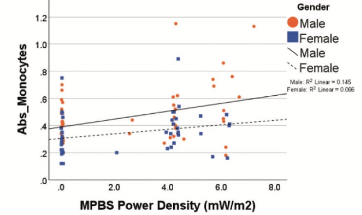 The data showed that higher in-home RF power density from nearby base stations was significantly associated with higher total leukocyte counts, as well as elevated basophils and monocytes.
