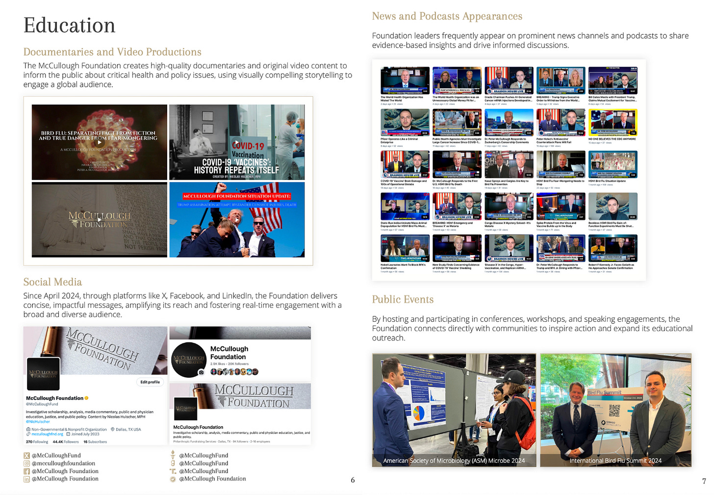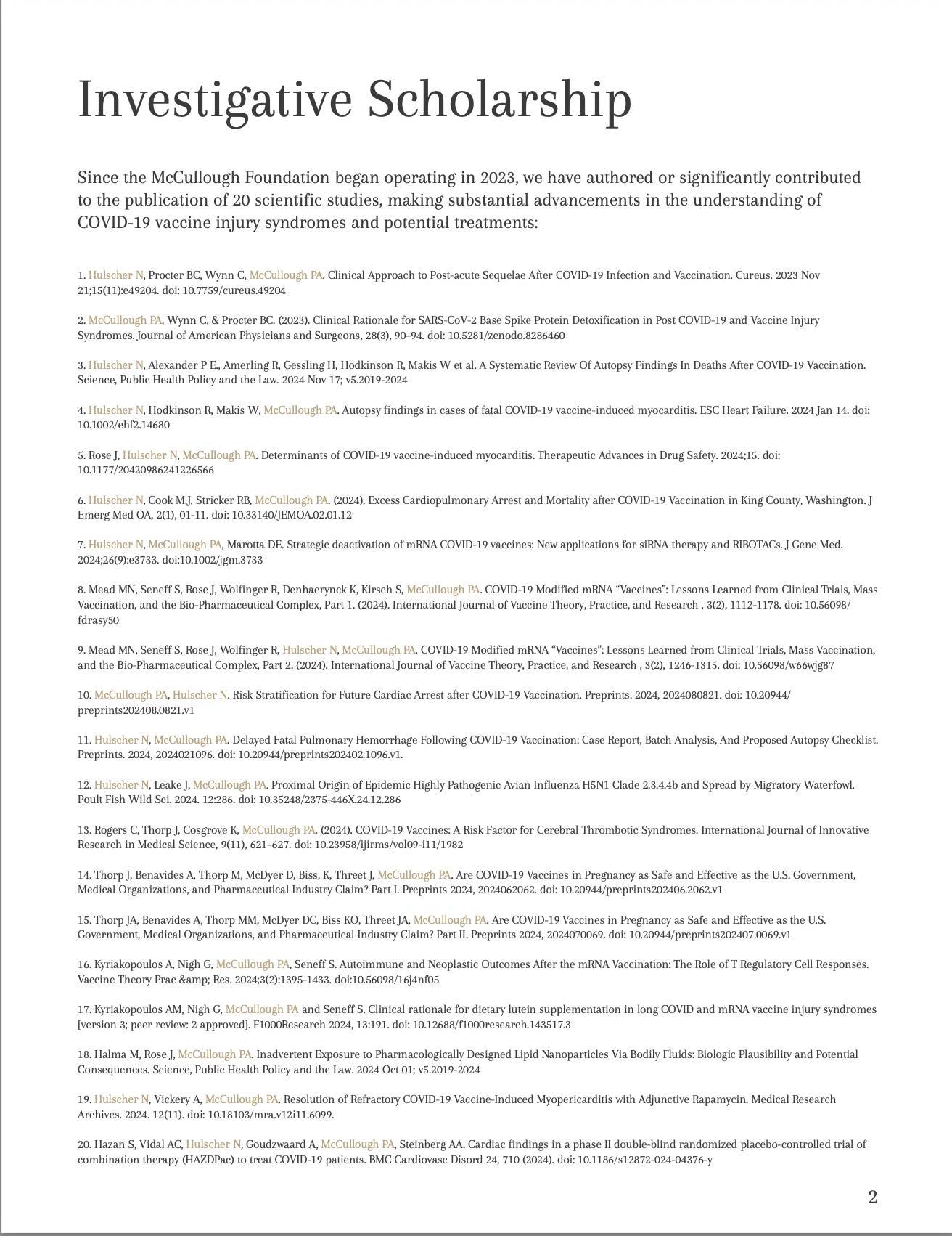 Since the McCullough Foundation began operating in 2023, we have authored or significantly contributed to the publication of over 20 scientific studies, making substantial advancements in the understanding of COVID-19 vaccine injury syndromes, their potential treatments, and the potential lab origins of H5N1 bird flu: