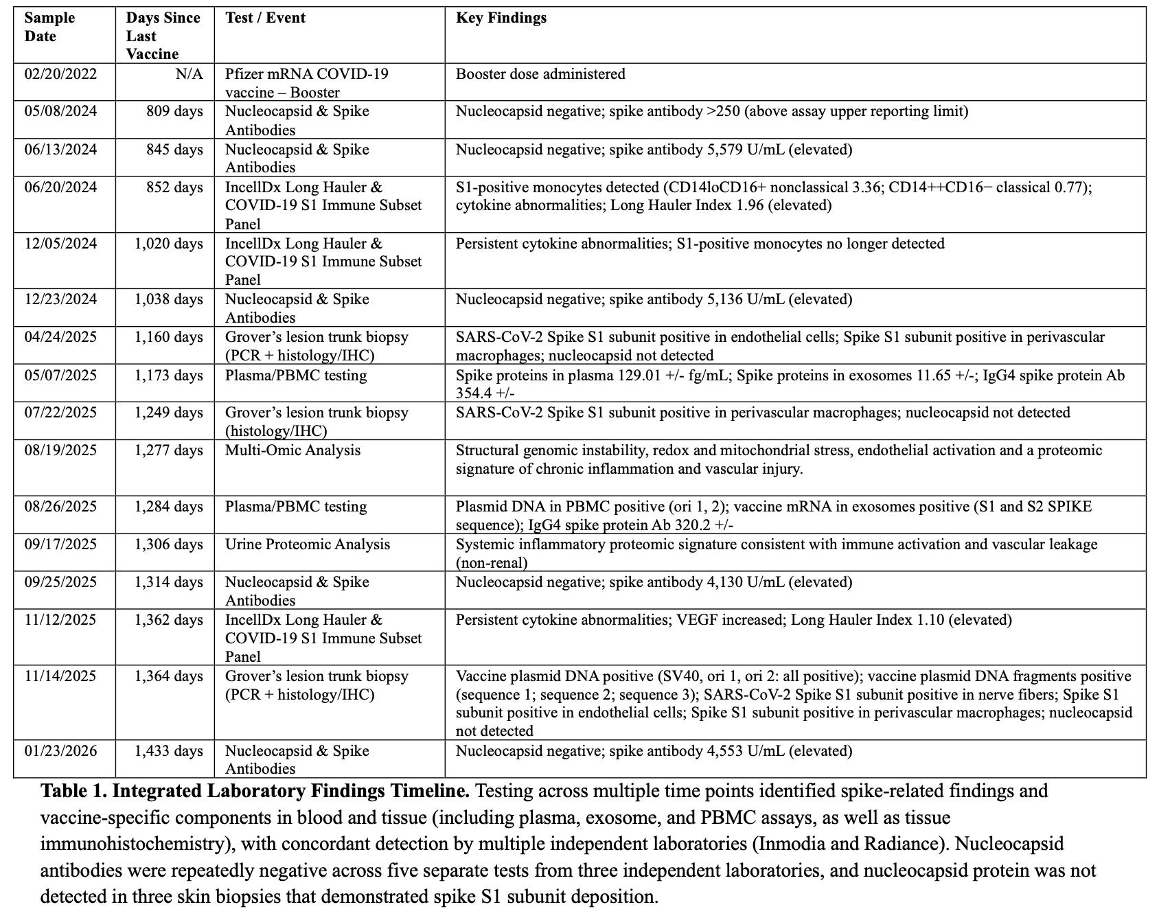 The resulting paper, titled “Unprecedented Persistence of Vaccine mRNA, Plasmid DNA, Spike Protein, and Genomic Dysregulation Over 3.5 Years Post–COVID-19 mRNA Vaccination,” presents what is, to our knowledge, the most comprehensive COVID-19 vaccine injury case report to date — involving >40 emergency department visits, >200 specialist encounters across 18 medical disciplines, >100 laboratory investigations, >100 imaging studies, and serial blood and tissue sampling performed at multiple timepoints over more than 3.5 years.
