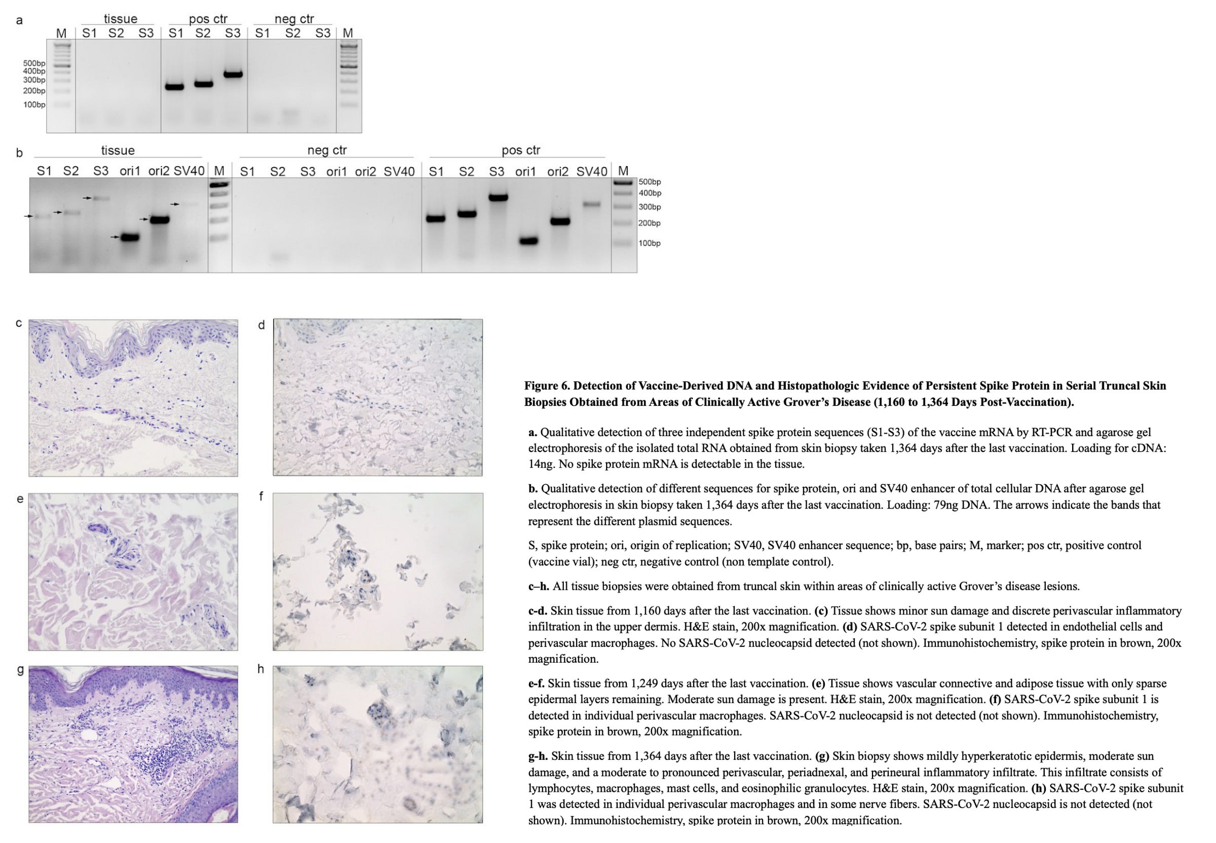 The 1,364-day skin biopsy contained multiple plasmid DNA elements, including spike gene sequences (S1–S3), ori1/ori2, and the SV40 enhancer, confirming durable retention of vaccine-derived DNA in somatic tissue by PCR amplification with agarose gel electrophoresis and Sanger sequencing.