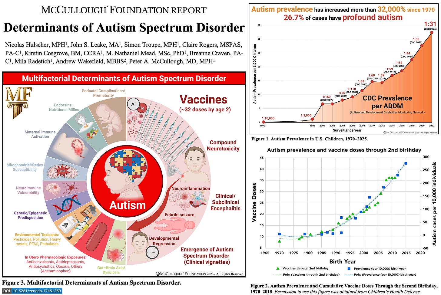 The McCullough Foundation report, by contrast, centers these mechanisms, demonstrating how genetic susceptibility, immune dysregulation, toxicant exposure, and clustered vaccine doses can converge during vulnerable neurodevelopmental windows.