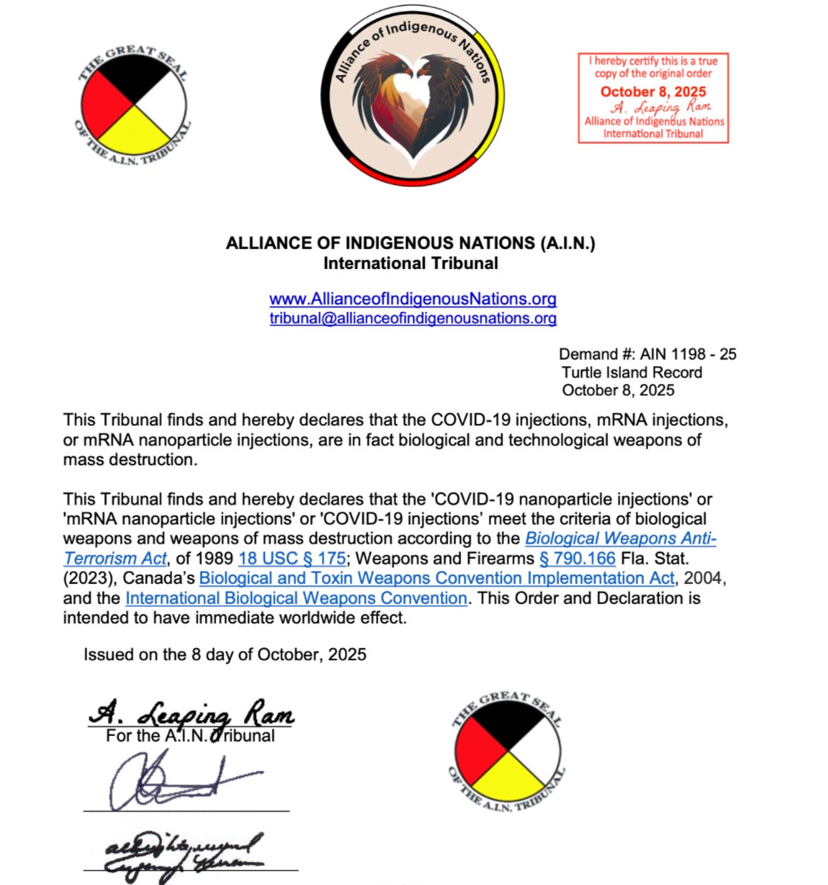 First reported by Dr. Joseph Sansone and Lisa Miron, in a stunning and historic move, the Alliance of Indigenous Nations (A.I.N.) International Tribunal has issued an ORDER and DECLARATION stating that “mRNA nanoparticle injections are in fact biological and technological weapons of mass destruction.”