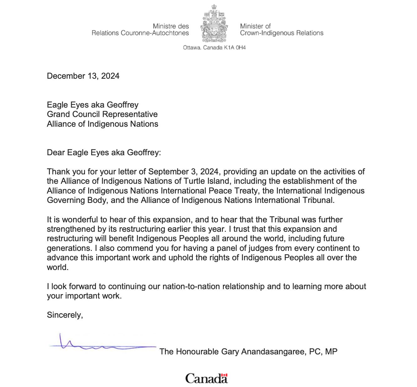 Here it’s important to note that in December 2024, Canada’s Ministry of Crown–Indigenous Relations and Northern Affairs (CIRNAC) formally acknowledged the Alliance of Indigenous Nations, its Treaty, and its International Tribunal—a judicial body composed of judges from every continent. In its official letter dated December 13, 2024, Canada affirmed that its relationship with the A.I.N. exists on a Nation-to-Nation basis, thereby recognizing the Tribunal as a sovereign legal authority under Indigenous and international law: