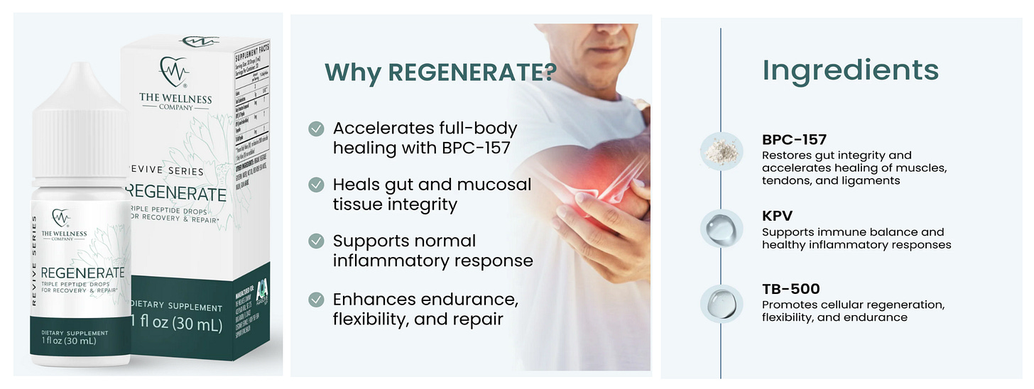 McCullough explained that REGENERATE is built around short‑chain bioactive peptides synthesized to mimic the body’s own repair signals. He described them as small amino‑acid chains originally identified in tissue‑healing research that activate cellular signaling pathways for mitochondrial biogenesis and autophagy. The formulation was developed to stimulate the release of growth factors such as IGF‑1 and VEGF, enhancing muscle recovery and reducing inflammatory cytokines that accumulate with age or viral injury. Unlike injected peptides used in sports medicine, REGENERATE’s oral blends combine stabilized peptide fractions with cofactors like zinc and vitamin E to extend bioavailability. McCullough stressed that TWC formulates within FDA dietary‑supplement rules, using laboratory‑synthesized peptides that don’t alter genetic expression and less likely to pose systemic risks of anabolic steroids or gene therapies. According to clinic feedback, users report improvements in energy, joint function, and restorative sleep after four to six weeks of daily use. The product, he said, is intended to help rebuild COVID‑19 or vaccine‑injured patients whose tissues exhibit persistent oxidative stress.