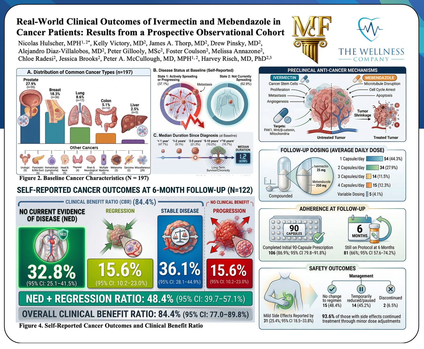 Nicolas Hulscher, MPH, Kelly Victory, MD, James A. Thorp, MD, Drew Pinsky, MD, Alejandro Diaz-Villalobos, MD, Peter Gillooly, MSc, Foster Coulson, Melissa Annazone, Chloe Radesi, Jessica Brooks, Peter A. McCullough, MD, MPH, & Harvey Risch, MD, PhD. (2026). Real-World Clinical Outcomes of Ivermectin and Mebendazole in Cancer Patients: Results from a Prospective Observational Cohort. Zenodo. https://doi.org/10.5281/zenodo.19455636