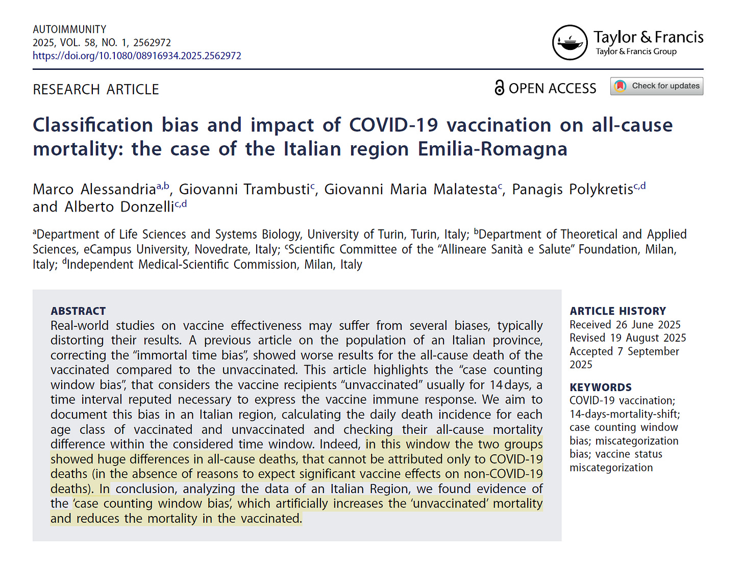 The paper notes that similar classification practices are used in other countries (e.g., UK Office for National Statistics), sometimes with a 21-day window. This suggests the bias may be widespread in observational studies of vaccine effectiveness. The authors call for greater transparency and publication of mortality data by vaccination status to enable more accurate analyses. [Classifica…ia-Romagna | PDF]
