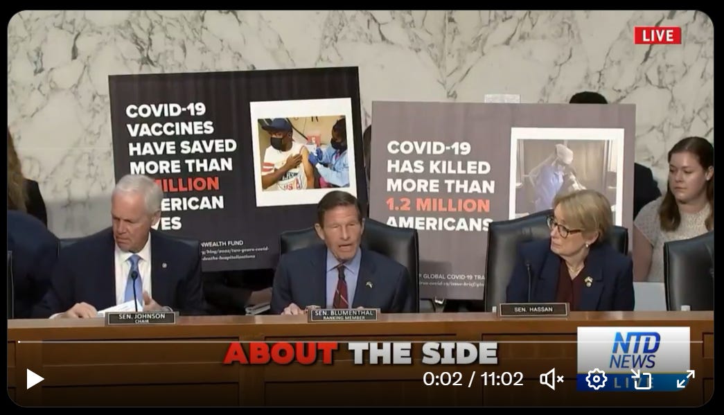 To the layperson, Senator Richard Blumenthal’s (D-CT) opening remarks on May 21, 2025 (Senate HSGAC PSI) about the severe COVID-19 death toll in the United States led one to believe the vaccination program was all worth it despite harms caused by the injections. He said vaccines saved “millions of lives.” Blumenthal had assistants put poster boards behind him for added effect.