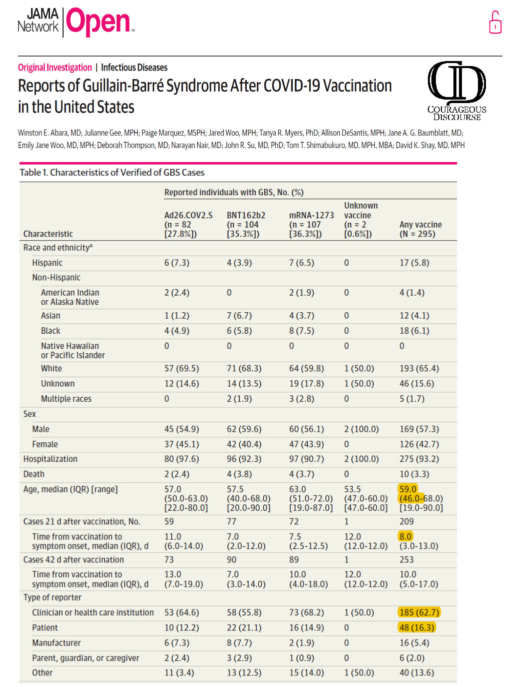 Of note, only 16% of cases reported by the patients themselves to the CDC leaving the majority to be reported by healthcare workers or the vaccine companies. The mean age was 59 years and sadly, 10 patients died after developing GBS. All but one of these cases died on the mechanical ventilator suggesting the systemic syndrome was far more lethal than GBS survived in other conditions (West Nile virus, Campylobacter jejuni, influenza vaccine etc.) These data strongly support FDA warnings for GBS in the FAQ for EUA vaccination and in all consent forms. This illness is a disaster for so many patients causing severe short and sometimes long term disability.