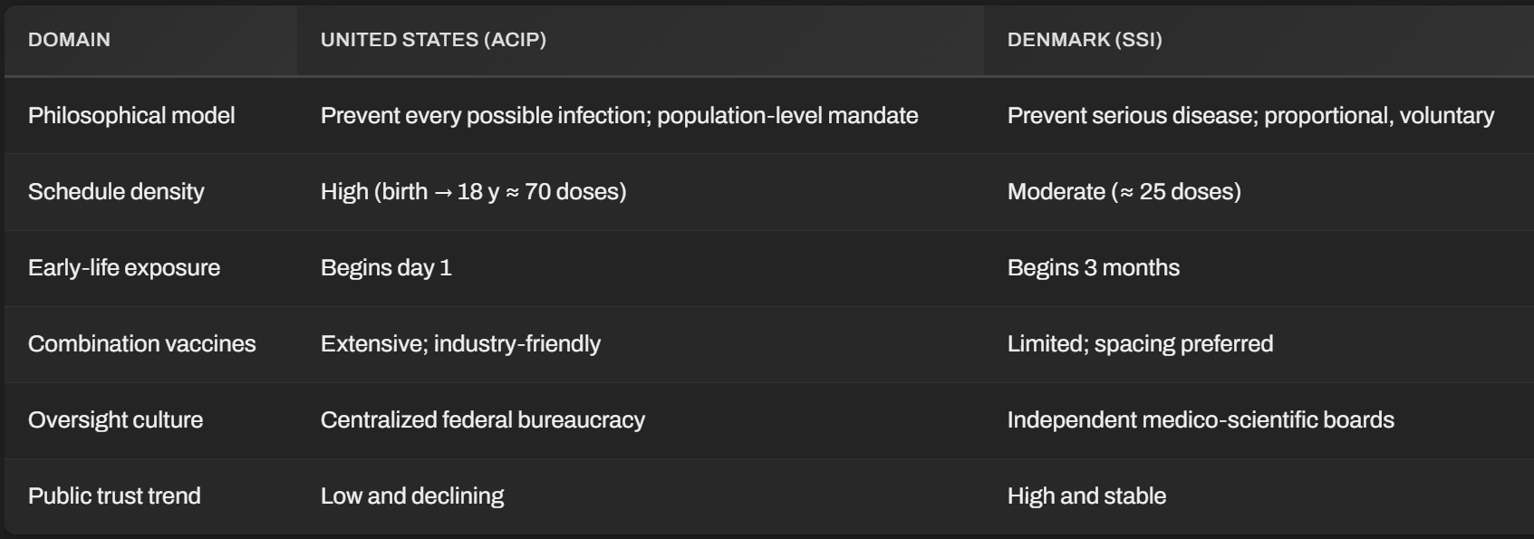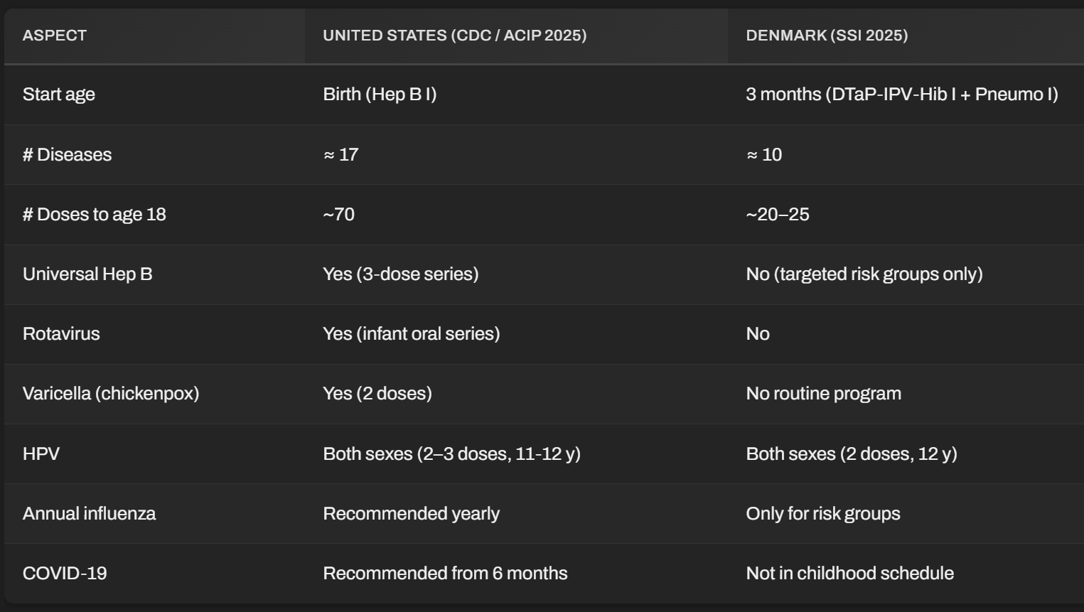 🇺🇸🧬 Comparing the U.S. CDC / ACIP Childhood Vaccine Schedule and Denmark’s Recommended Childhood Vaccinations