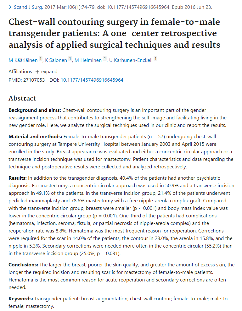 Someone asked me if bilateral mastectomies performed on normal, still growing young women for gender change are more complicated than having a breast removed for cancer is an older adult women. I found this instructive paper by Kääriäinen and coworkers from Department of Plastic and Reconstructive Surgery, Tampere University Hospital, Tampere, Finland.