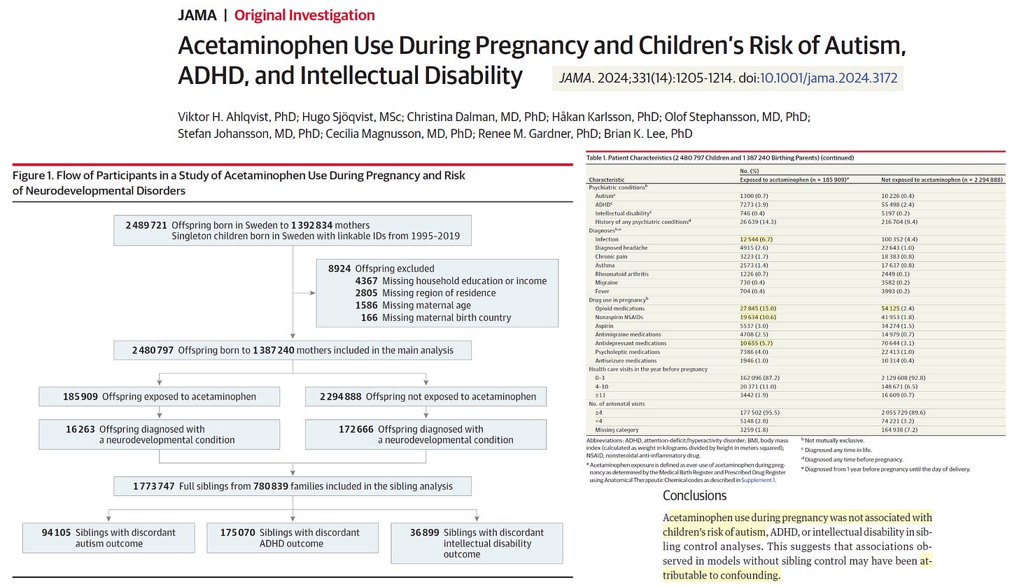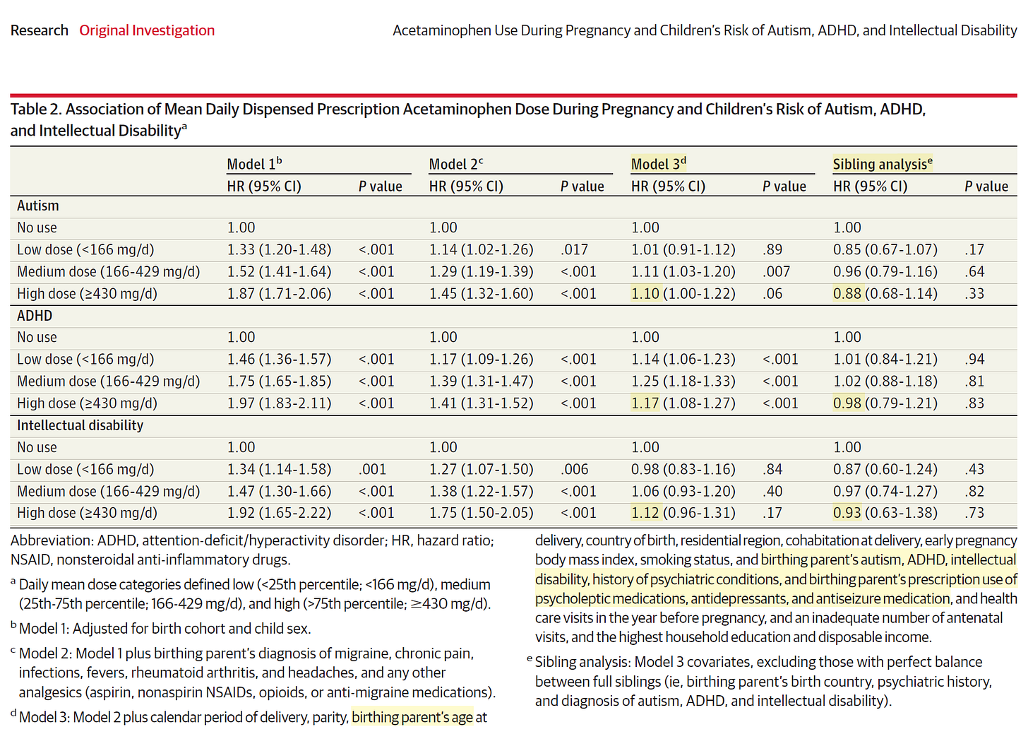 The key to understanding Ahlqvist as a valid source of evidence is Table 2 depicting the multivariate analysis controlling for other possible determinants of neuropsychiatric disorders: age of parents, early delivery, birthing parent’s autism, parental ADHD, intellectual disability, history of psychiatric conditions, and parent’s use of psycholeptic medications, antidepressants, and anti-epileptic medication. Note that acetaminophen at medium and higher doses (means it was taken on most days during nine months) as determined by structured nurse-midwife assessment had modest <20% excess risk that remained statistically significant for autism, ADHD, and intellectual disability. None of this was confirmed by examining siblings born to the same parents where one was exposed to acetaminophen and the other was not. A common scenario listed in the supplemental materials where a woman took acetaminophen during one pregnancy and not in another was migraine headaches.