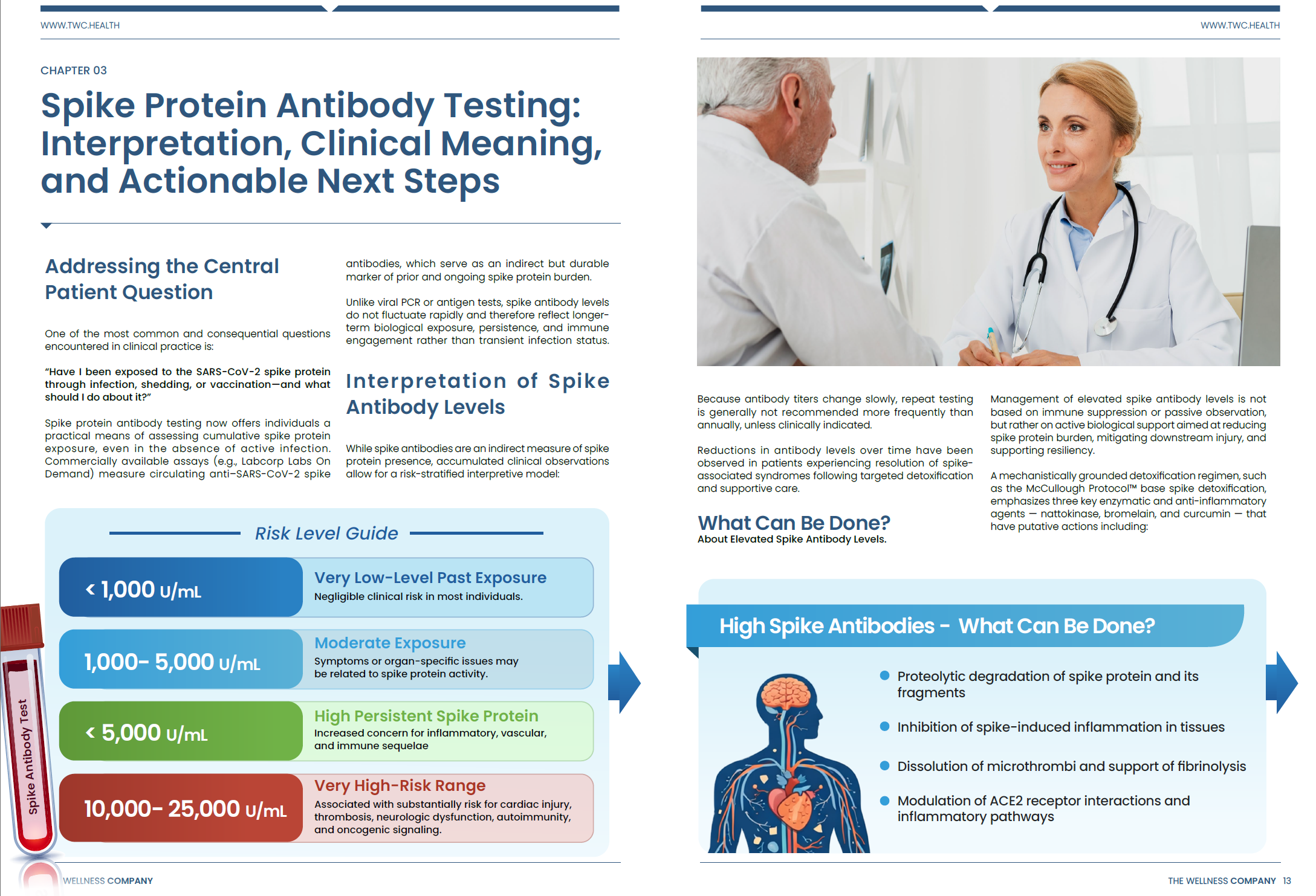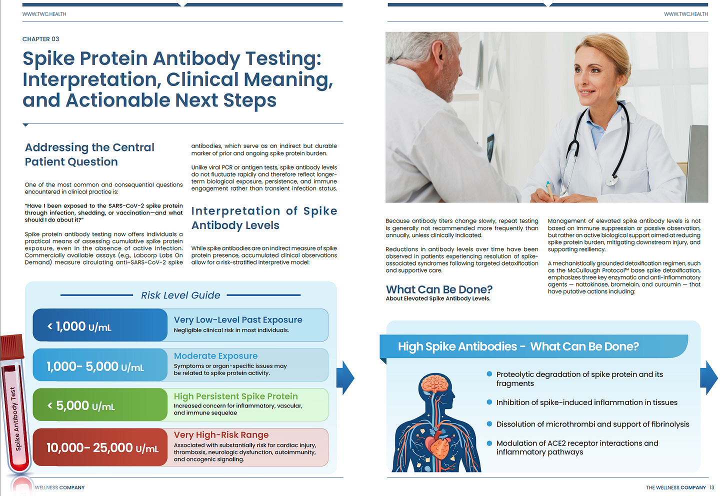 The Wellness Company’s Ultimate Spike Detox, featuring nattokinase, bromelain + curcumin designed to clear residual spike protein is the most significant advancement to date for long-COVID and post-vaccine injury syndromes. McCullough encourages listeners to self‑check antibody levels via LabCorp’s $69 test kit. He believes lingering spike burden above 1,000 U/mL correlates with symptoms and risk of long term consequences. Spike detoxification takes a year or longer to reduce Spike antibodies to a safe level.