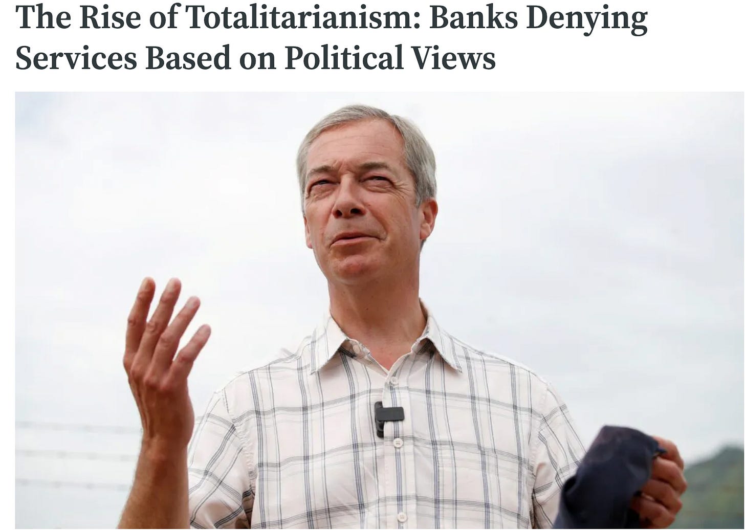 Paying for it brings me to the subject of this morning’s post. I just read in the Epoch Times a wonderful essay by the British retired doctor and author, Theodore Dalrymple, whose essays and books I highly recommend. Dalrymple reports that the Coutts Bank—one of the oldest and most fabled money institutions in England—has closed the bank account of British politician, Nigel Farage for the crime of … expressing the wrong opinions.