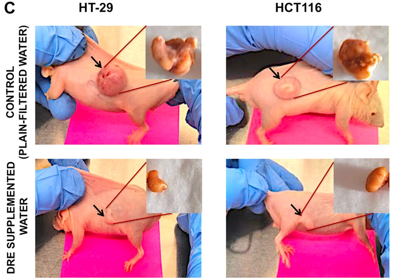 Figure 4 from the paper shows the difference visually: control mice developed massive tumors, while DRE-treated mice barely formed any tumor mass at all. Even late in the 75-day study, tumor volumes remained extremely small.