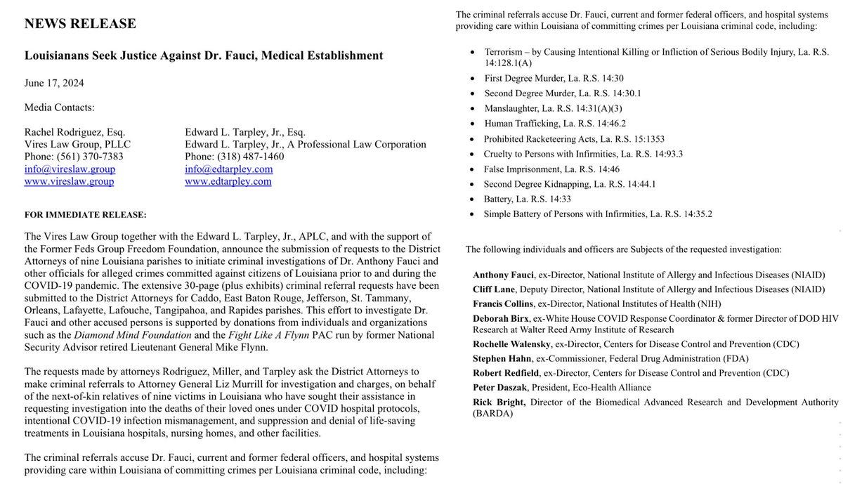 The criminal referrals accuse Dr. Fauci, current and former federal officers, and hospital systems providing care within Louisiana of committing crimes per Louisiana criminal code, including:
