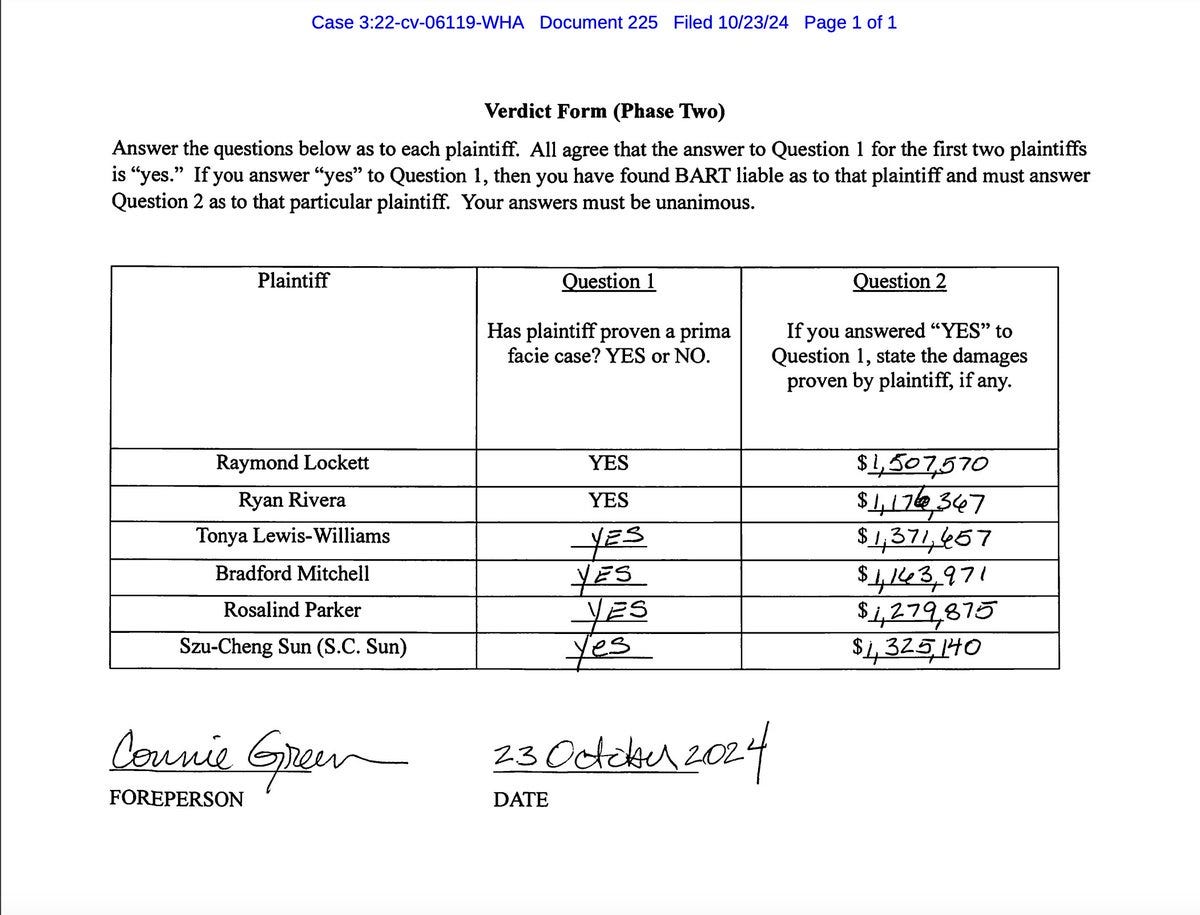 The jury awarded over $1 million to each of six former BART employees who were fired for seeking religious exemptions from the COVID-19 vaccine mandate. The court rejected BART's claim of undue hardship, ruling the firings violated their religious rights. This landmark decision came after nearly three years of struggle.