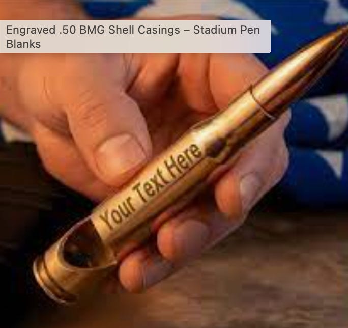The mocking engravings suggest that the shooter may have been hanging around gun shows — a good place to find an old Mauser 98 rifle — where one often sees artisans in the business of inscribing the brass casings of rifle cartridges (like the following .50 caliber cartridge).