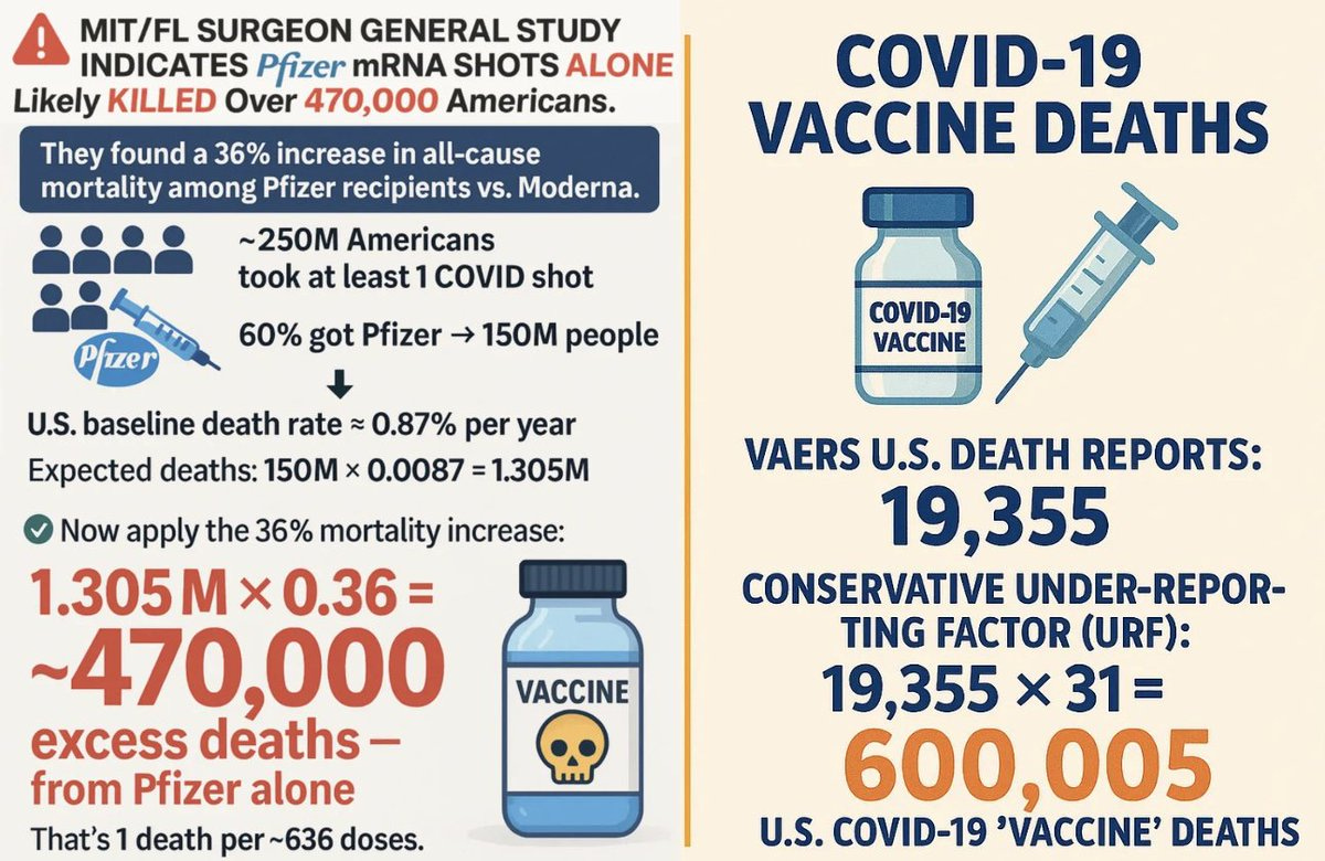 Another independent U.S. COVID-19 vaccine death toll estimation based on the study headed by Professor Retsef Levi and Florida Surgeon General Dr. Joseph Ladapo titled, Twelve-Month All-Cause Mortality after Initial COVID-19 Vaccination with Pfizer-BioNTech or mRNA-1273 among Adults Living in Florida, yields a highly conservative estimate of 470,000 American deaths from the Pfizer mRNA shots alone.