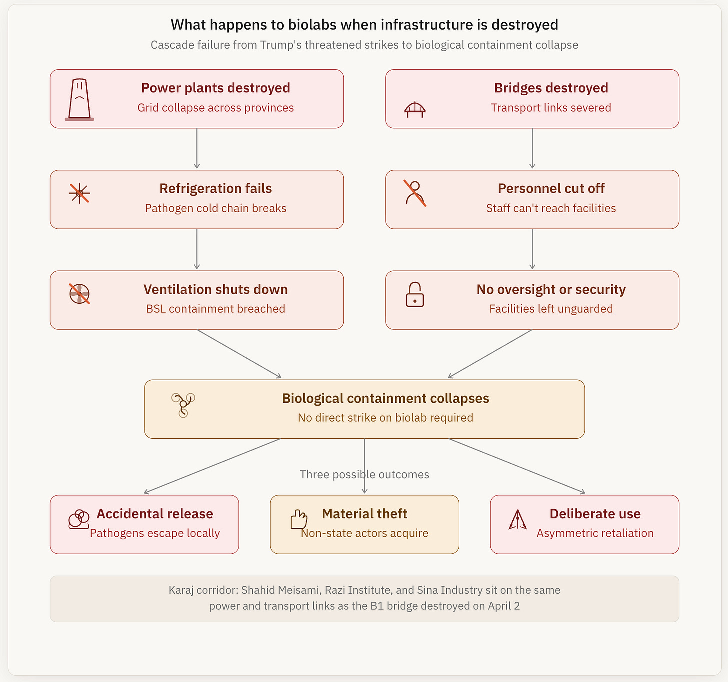Biological containment depends on electricity, refrigeration, ventilation, and personnel access — all of which collapse when you destroy a country's power grid and bridges. If “Power Plant Day” happens tonight, multiple dual-use biological facilities in Iran could face simultaneous containment failure.